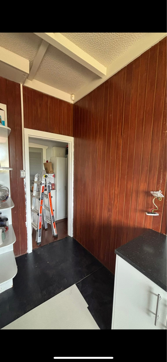 The kitchen walls were previously wood and have now been fully replaced with high-quality PVC panels.
