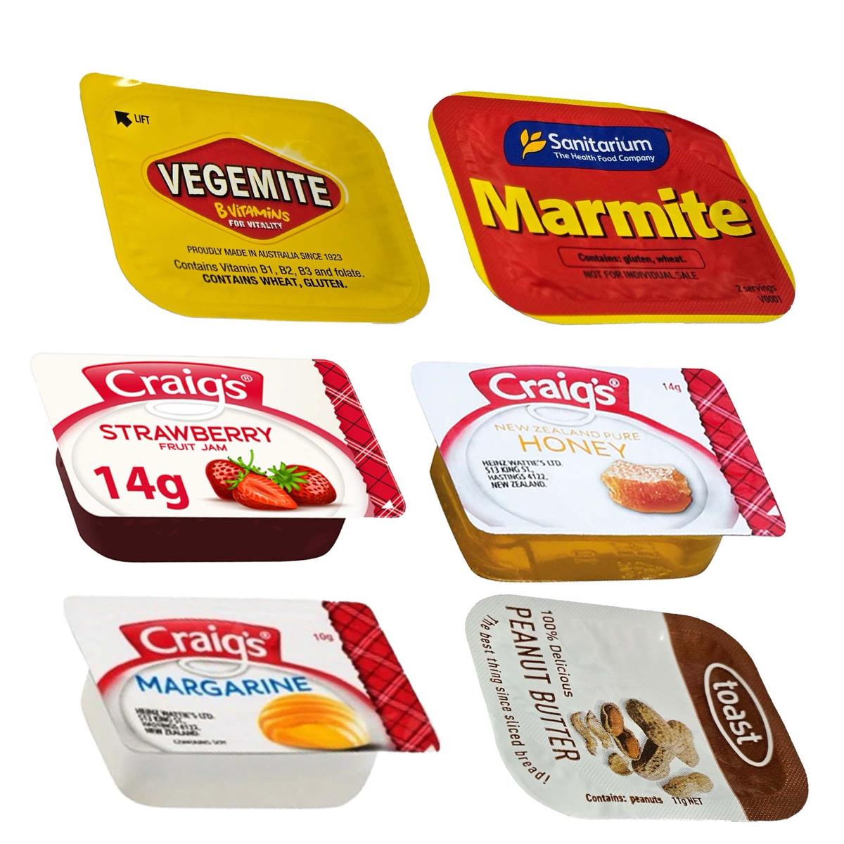 We always have plenty of butter, margarine, other jams, marmite and Vegemite. Salt & Pepper, sugar, tartare sauce and aioli. And also coffee, tea bags in foil and milk.