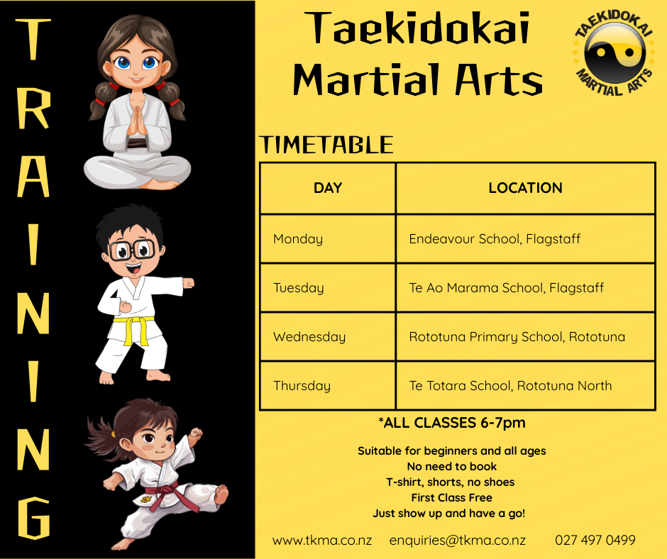 I look forward to seeing you in a class near you. If you need to contact me for any reason, you can get me on 027 497 0499 or on enquiries@tkma.co.nz