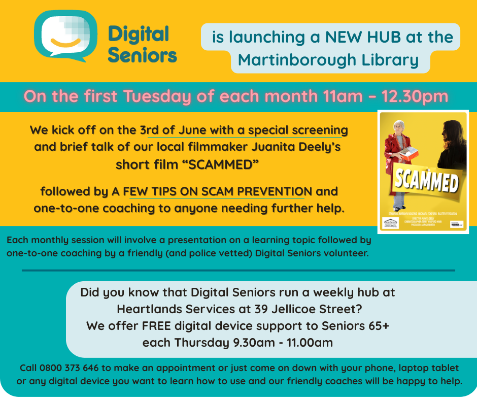 Join us at 11am next Tuesday the 2nd September at Martinborough Library for a Q&A session about Malware brought to you by Digital Senior's Rhonda McCormick and the Wairarapa Library Service - Coaches will be available afterwards for one-to-one help with anything digital and remember we are… View moreJoin us at 11am next Tuesday the 2nd September at Martinborough Library for a Q&A session about Malware brought to you by Digital Senior's Rhonda McCormick and the Wairarapa Library Service - Coaches will be available afterwards for one-to-one help with anything digital and remember we are also available each week on Thursday morning 9.30am - 11.00am at Heartland Services 39 Jellicoe Street - Call 0800 373 646 to make an appointment or just come on down with your phone, laptop or tablet.