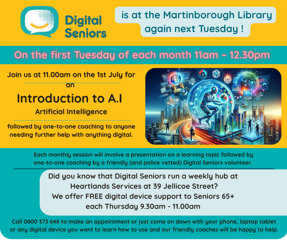 Join us at 11am next Tuesday the 1st July at Martinborough Library for an Introduction to A.I - Artificial Intelligence - brought to you by Digital Seniors Volunteer Coach - Hartmut Otting and the Wairarapa Library Service - Coaches will be available afterwards for one-to-one help with anything … View moreJoin us at 11am next Tuesday the 1st July at Martinborough Library for an Introduction to A.I - Artificial Intelligence - brought to you by Digital Seniors Volunteer Coach - Hartmut Otting and the Wairarapa Library Service - Coaches will be available afterwards for one-to-one help with anything digital and remember we are also available each week on Thursday morning 9.30am - 11.00am at Heartland Services 39 Jellicoe Street - Call 0800 373 646 to make an appointment or just come on down with your phone, laptop or tablet.