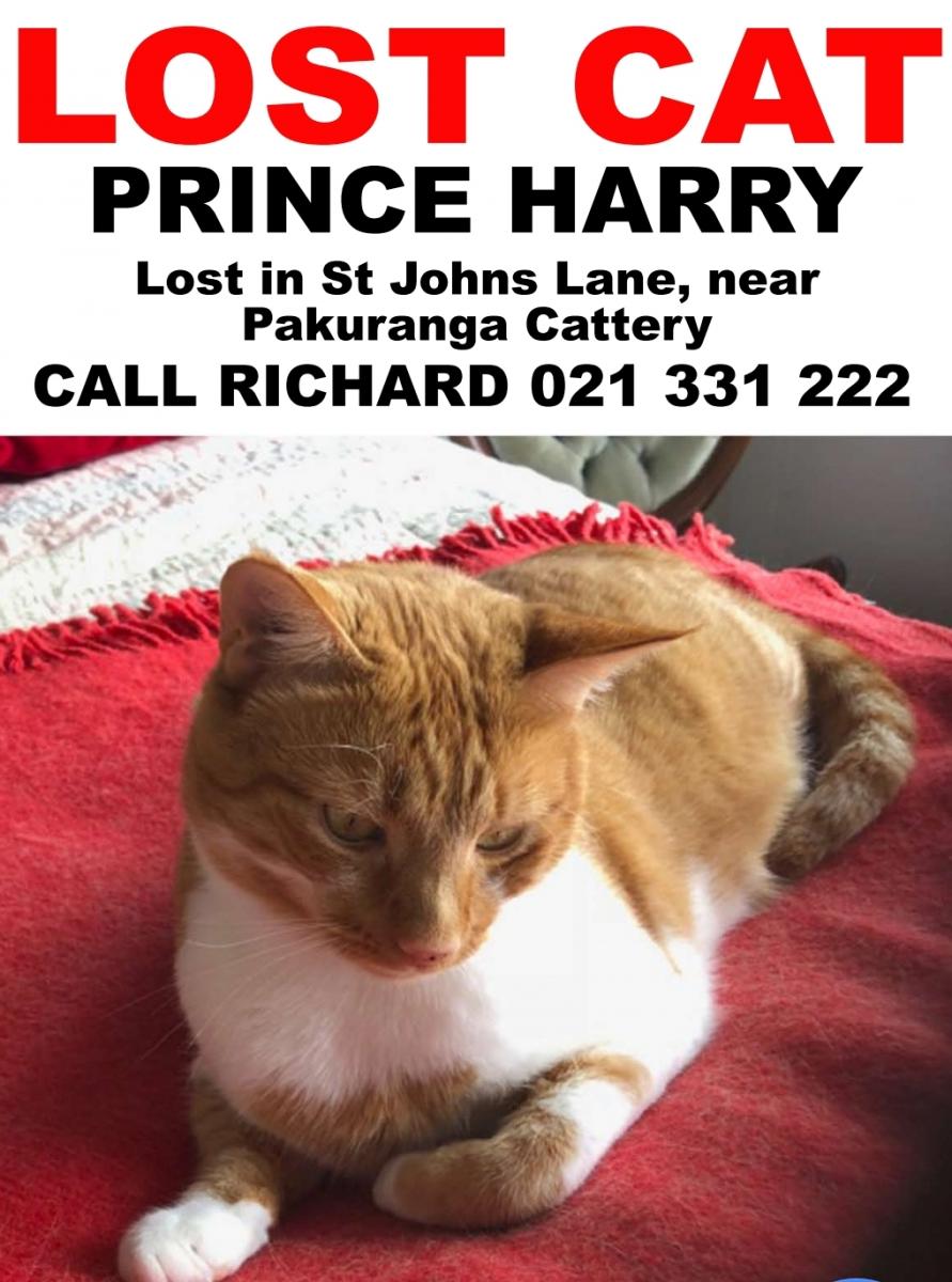 Prince Harry jumped out of a car outside a cattery in pakuranga. Last seen Johns Lane - Udys Road area.