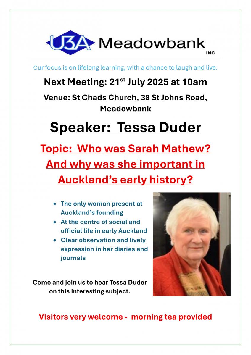 U3A Meadowbank's October monthly meeting will be held on October 20th 2025 at St Chads Church, 38 St Johns Road, Meadowbank at 10 am, main speaker at 11 am.