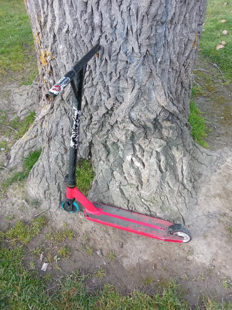 On my walk through Dudley Park this morning, I spotted this well-used scooter in the grass. I have propped it up against a tree, next to the park pathway, near the white arched entrance. If you own it, please collect.