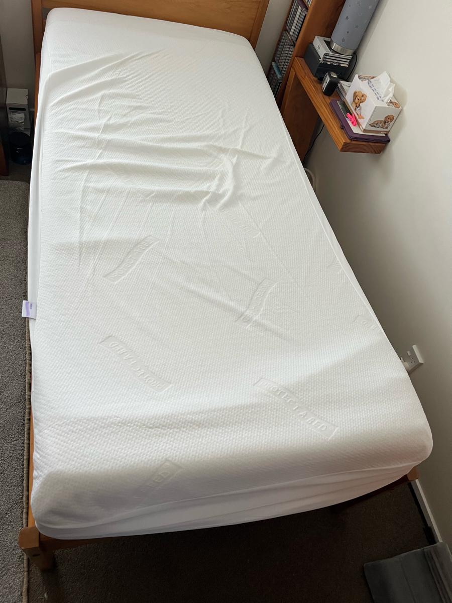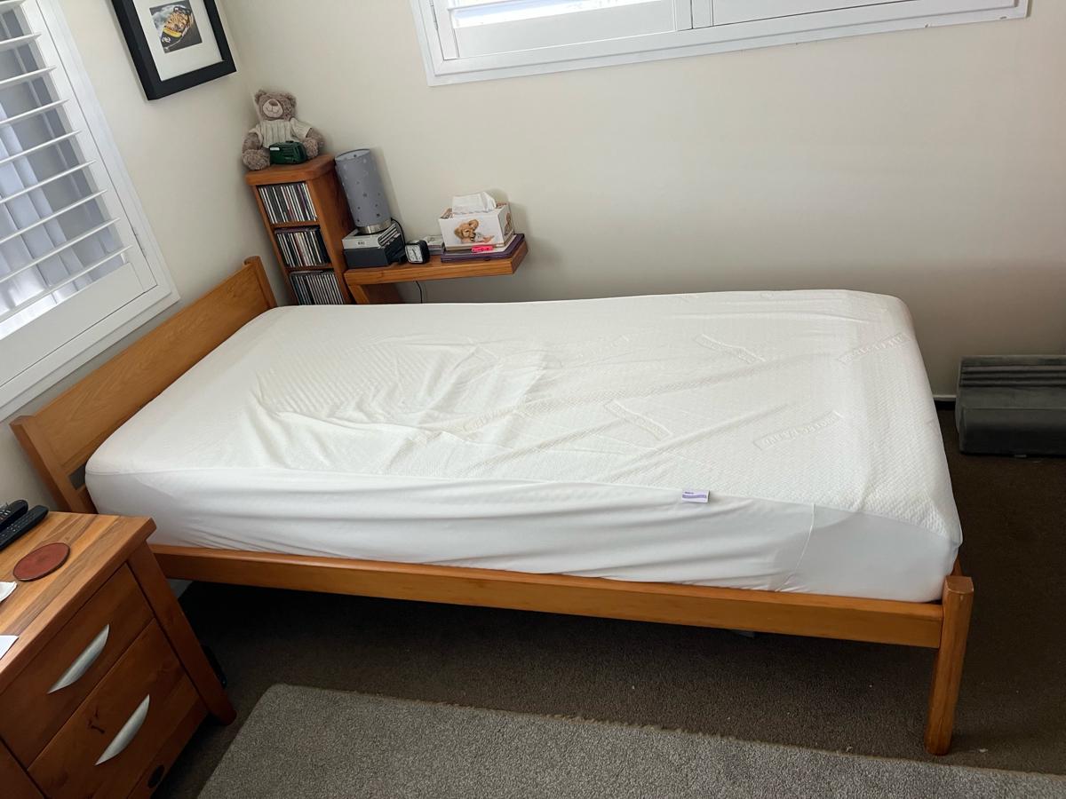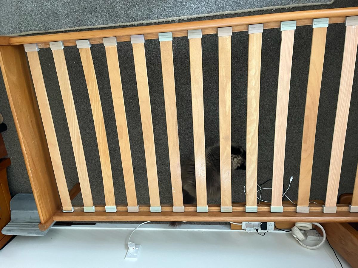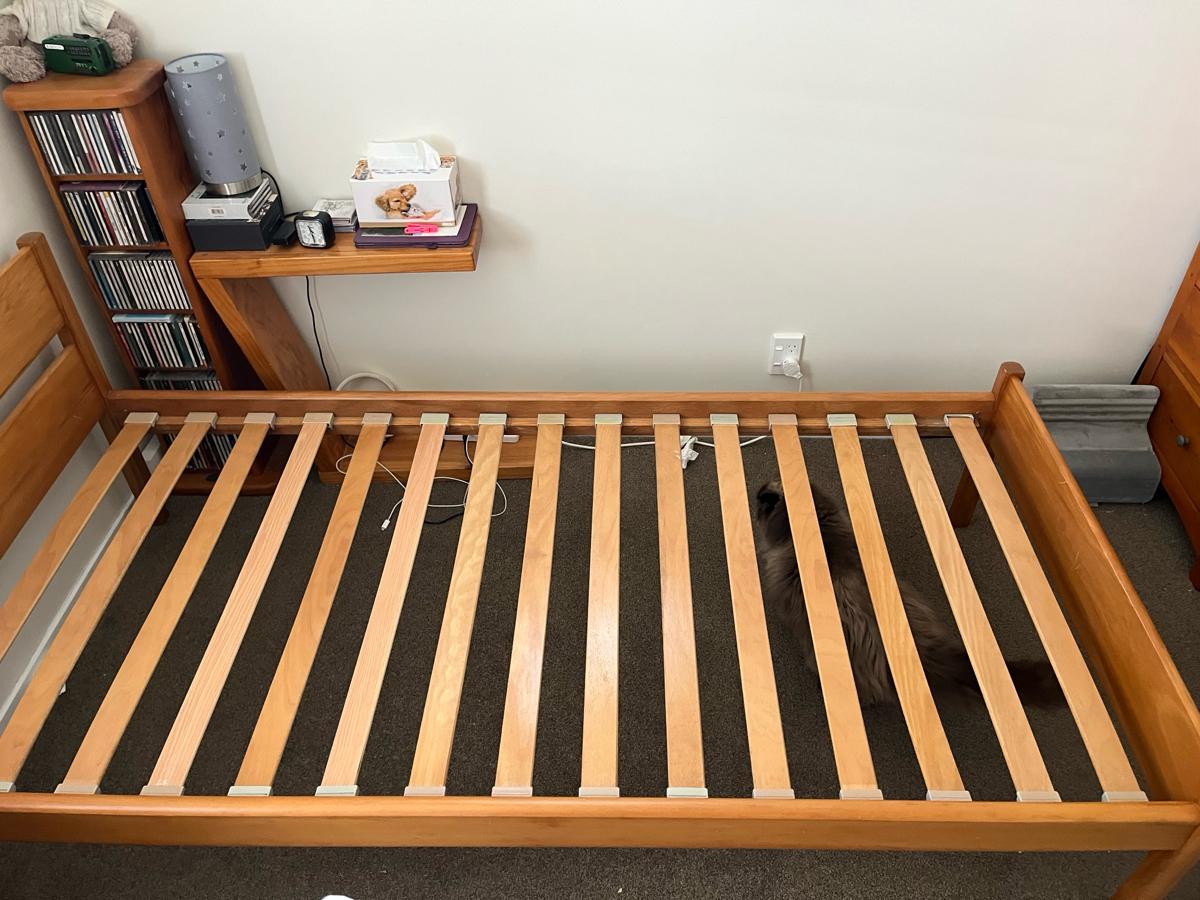 The bed base is rimu. The slats are all good. Some of the plastic slat holders (I think 4) are slightly broken but still work fine.