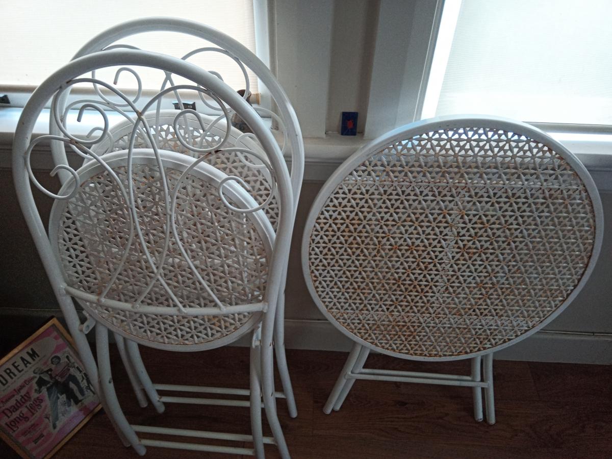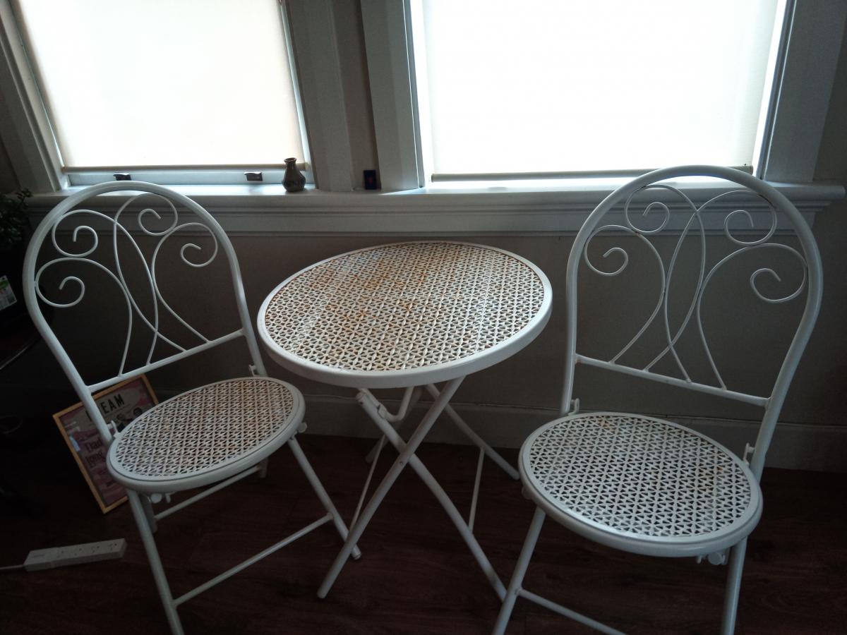 We love this set, but our new place doesn't have a balcony, so they're surplus to requirements. A little rusty from being outside but apart from that in good condition. We put a table cloth over it and it looks quite pretty.