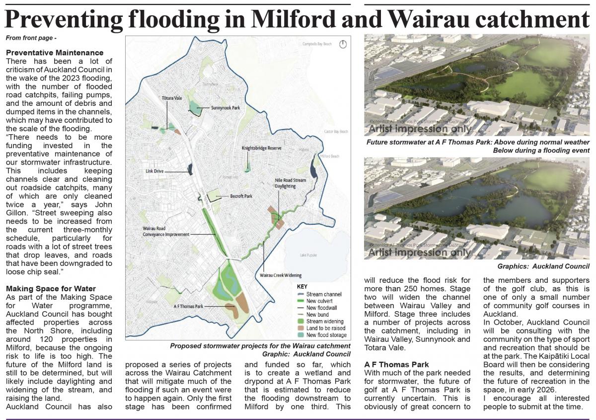 You may have seen a couple of different proposals for the golf course area at A.F. Thomas Park. One is from Takapuna Golf for an 18 hole course; another is from Golf Warehouse for a 9 hole course with other recreational activities. Both proposals work around the wetland that council (Healthy … View moreYou may have seen a couple of different proposals for the golf course area at A.F. Thomas Park. One is from Takapuna Golf for an 18 hole course; another is from Golf Warehouse for a 9 hole course with other recreational activities. Both proposals work around the wetland that council (Healthy Waters) has already decided to create at the park to help store stormwater and minimise future flooding downstream in Milford. The stormwater part of the project will take up to 2 years to complete and will reshape most of the park, leading to the question about what to do with the rest of the park.
