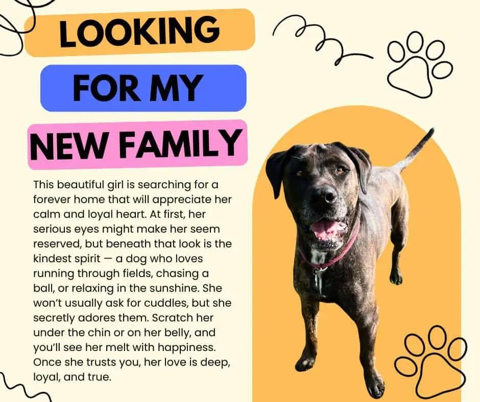 At first, her serious eyes might make her seem reserved, but beneath that look is the kindest spirit — a dog who loves running through fields, chasing a ball, or relaxing in the sunshine.