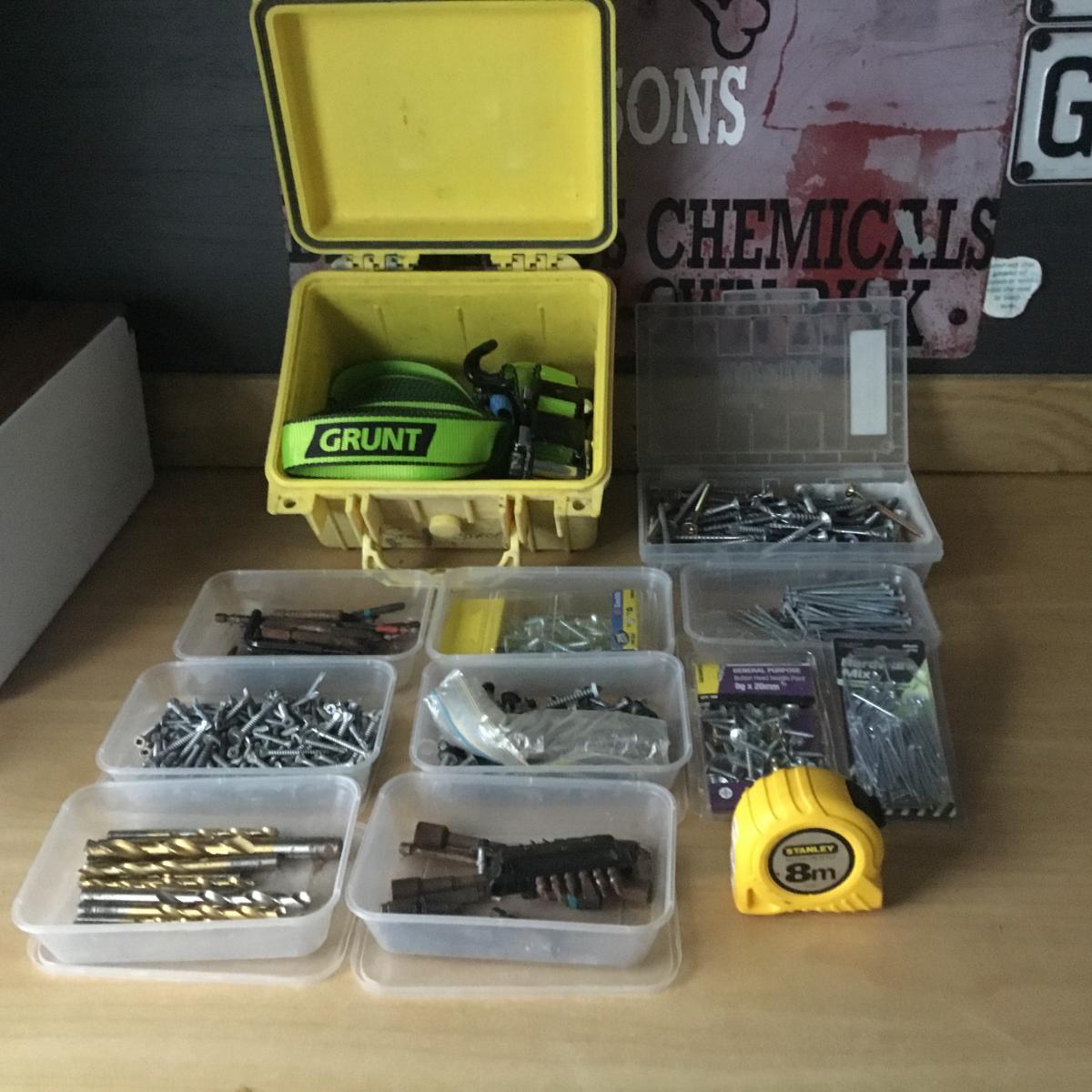 Selection of items due to me moving into a retirement home not needed, yes bit of a mix does include the storage box plus hacksaw hammer tape measure Brand New Set of Strops 5.5 mtrs long 750 kg rated weedmat electrical bits n bobs etc etc .