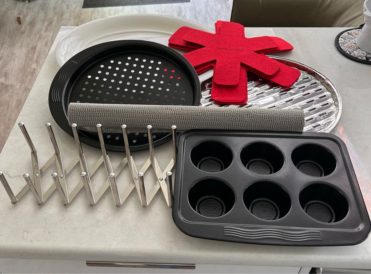 Expandable Organiser, Muffin Tin, Pizza Plate, x3 Aluminium Trays, Plastic Platter, Drawer Liner, x4 Pan Protectors. Contact 0211584080. Thanks