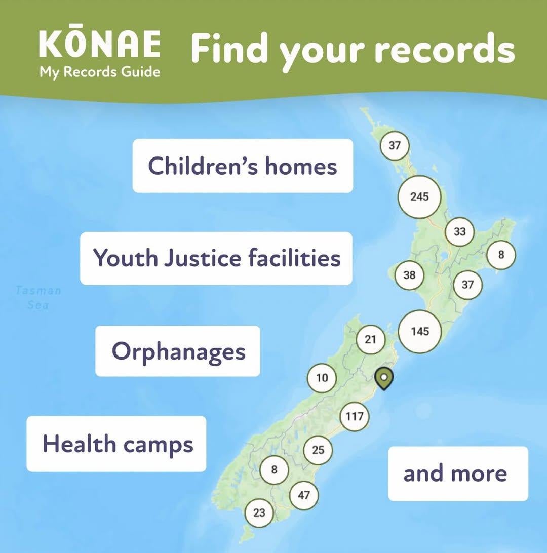 Kōnae has information on more than 60 state and faith-based organisations that have records for over 800 homes and places in Aotearoa New Zealand about people who have been in their guardianship or care.