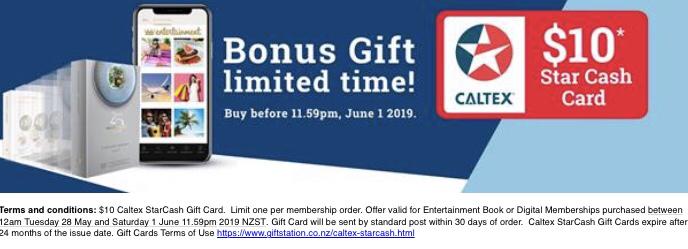When you buy an Entertainment Membership online you will also receive a bonus $10 Caltex StarCash Gift Card! (From 12am Tuesday 28 May to Saturday 1 June 11:59 pm NZST.)