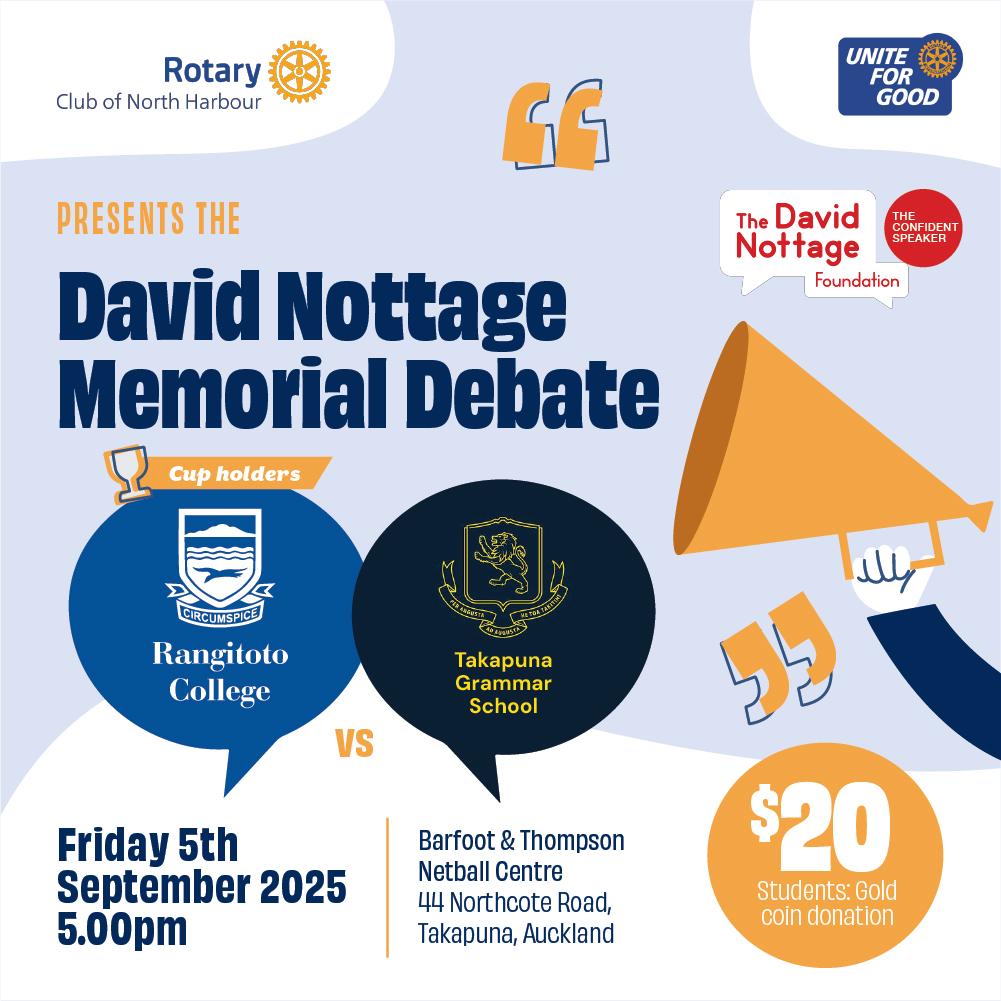 Join … View moreTwo great schools, Rangitoto College and Takapuna Grammar are vying for the prestigious David Nottage Memorial Cup. Will cup holders Rangitoto retain the cup or will Takapuna Grammar win the day. The school teams will be joined by well-known identities Dr Wayne Mapp and Kevin McCaffrey.