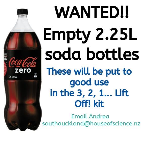 Do you have empty 2.25L soft drink bottles or know where I can get them from? House of Science requires a continuous supply of these bottles for the '3, 2, 1 Lift Off!' kit. We're a charity so if we can source these bottles for free and repurpose them for education, then it's a … View moreDo you have empty 2.25L soft drink bottles or know where I can get them from? House of Science requires a continuous supply of these bottles for the '3, 2, 1 Lift Off!' kit. We're a charity so if we can source these bottles for free and repurpose them for education, then it's a win-win situation! The bottles are used as a rocket launcher for a 'Stomp rocket' activity plus they are the 'rocket' launched using an Aquapod rocket launcher. Please email me to arrange pickup/drop off (I don't check this feed so please don't message). Thanks!!