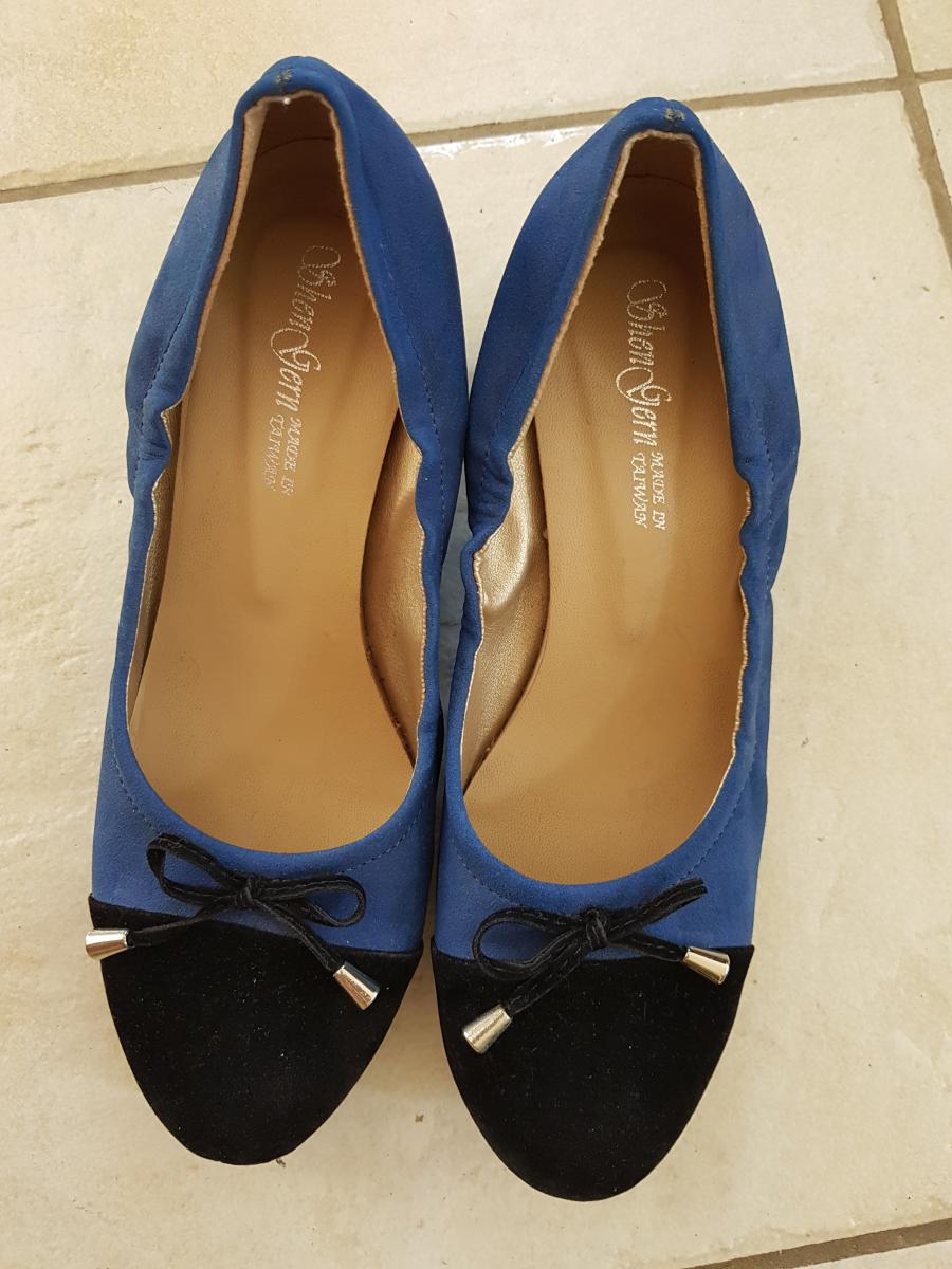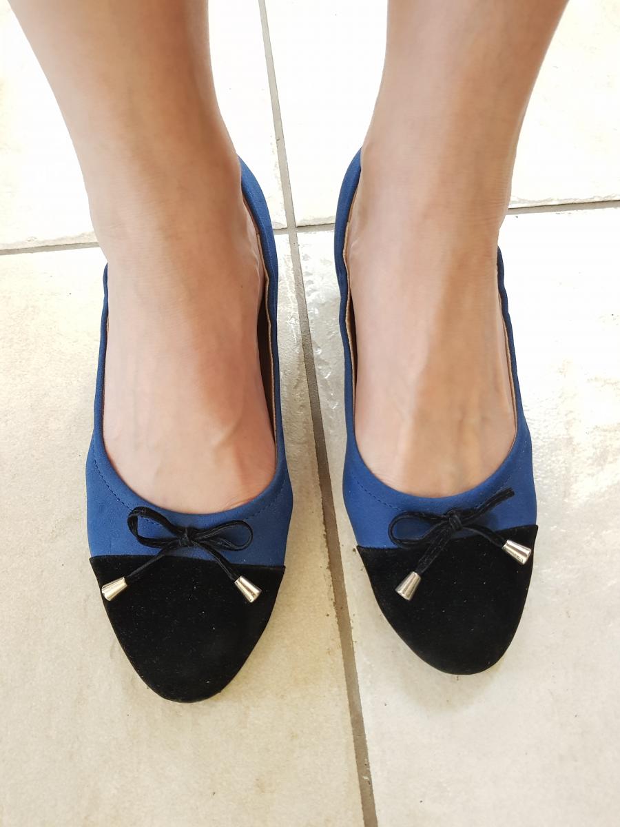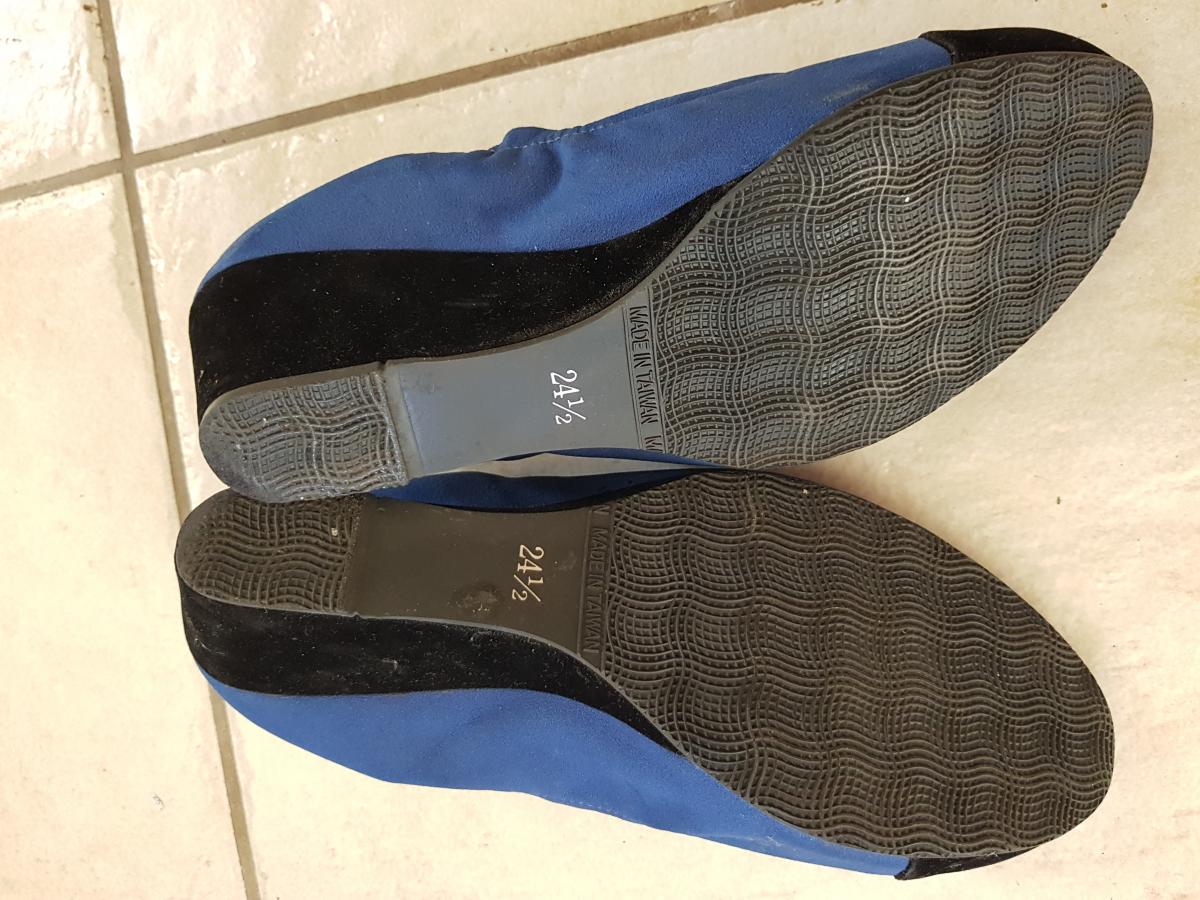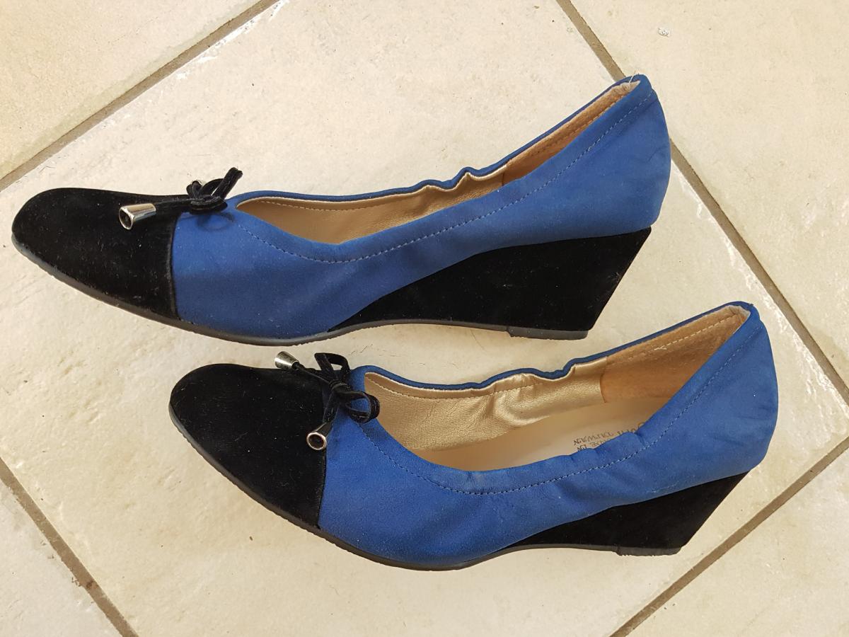 Black & blue wedge heels with a cute bowtie detail, very comfortable to walk in, great for the office.