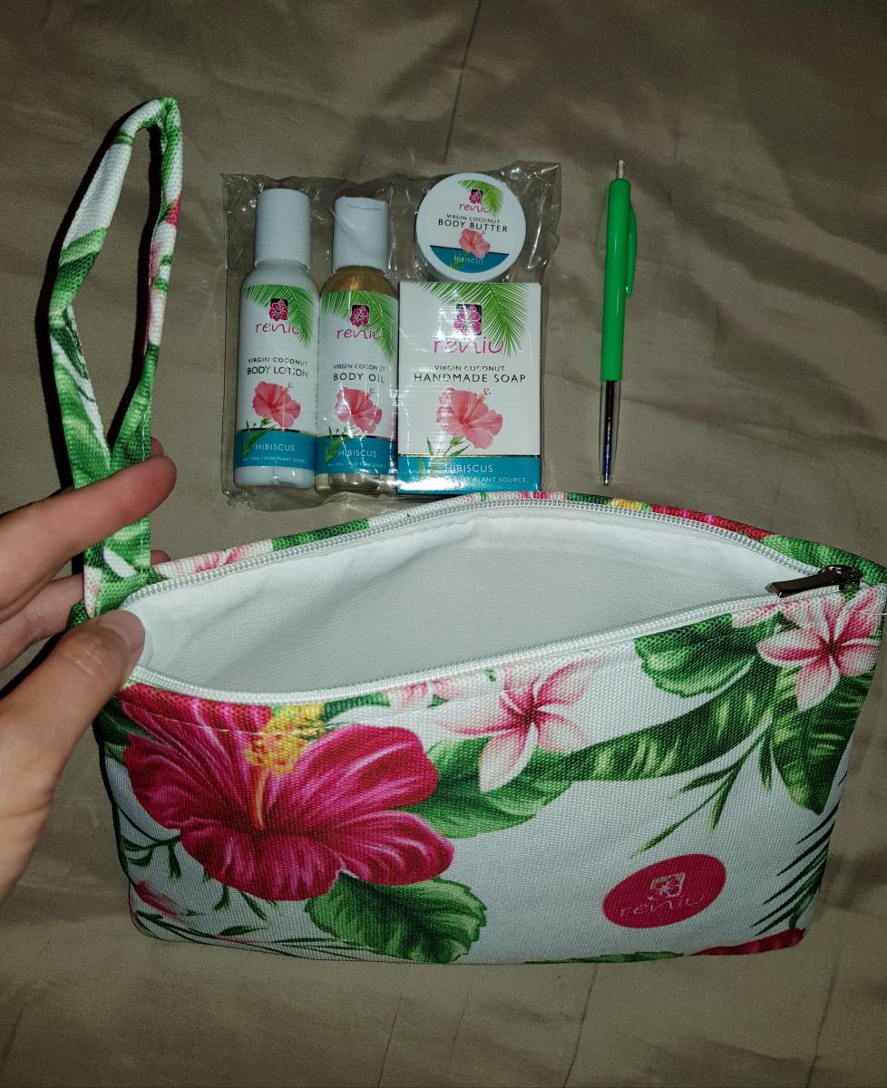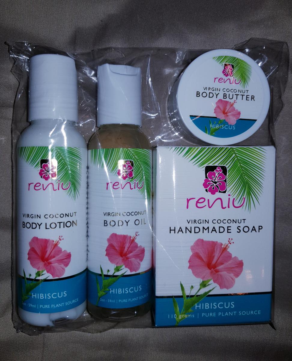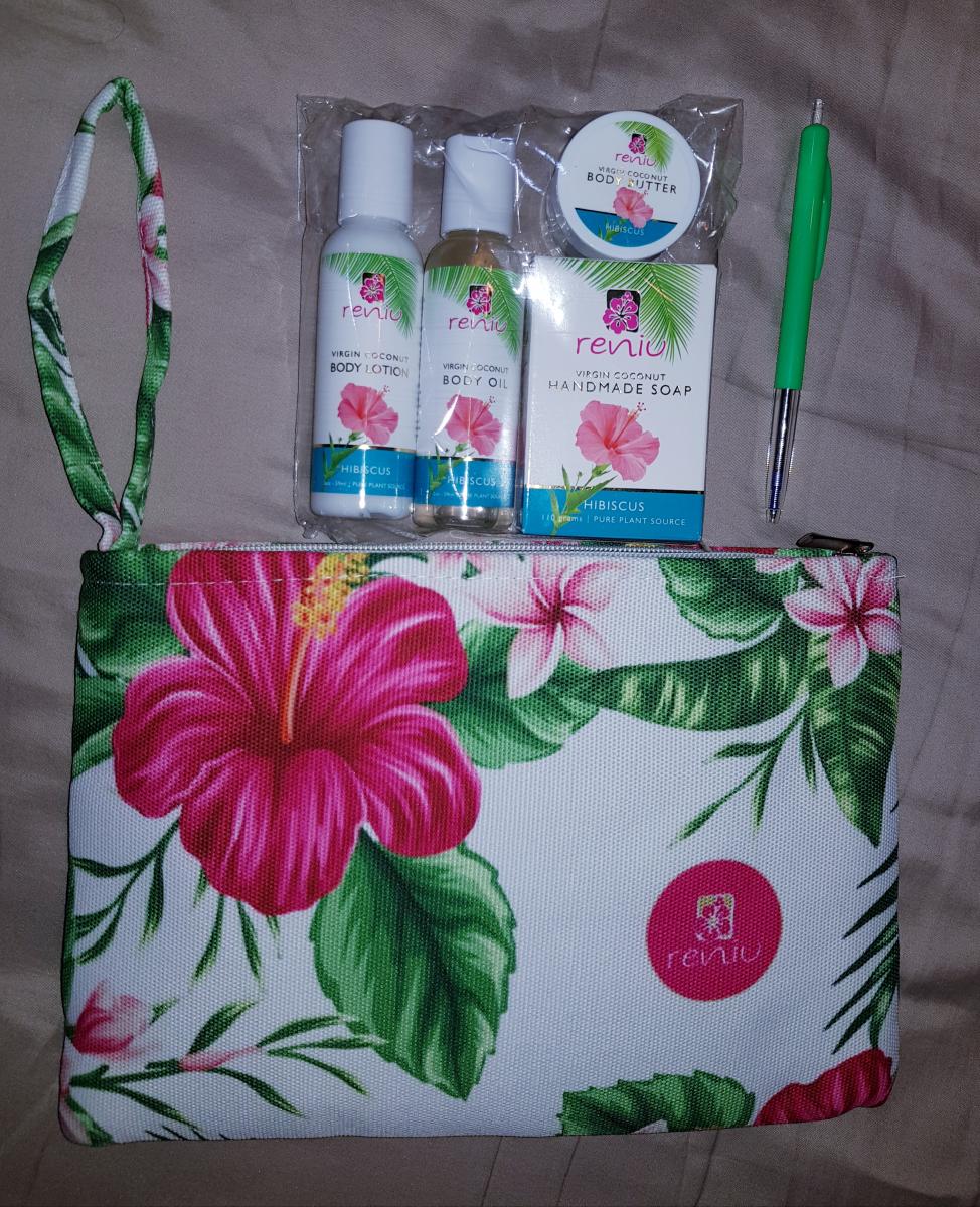 Reniu (by Pure Fiji) Bodycare gift set in a luxurious Hibiscus infusion in a cute floral cosmetic/make up bag, for $40