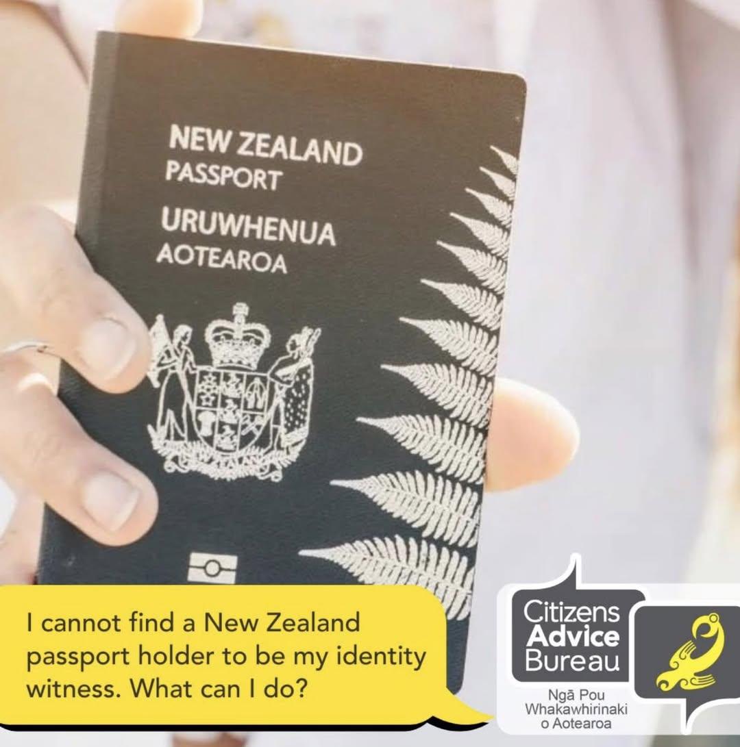 [Image description: Person in the background, holding up a New Zealand passport. Text reads 'I cannot find a New Zealand passport holder to be my identity witness. What can I do?]