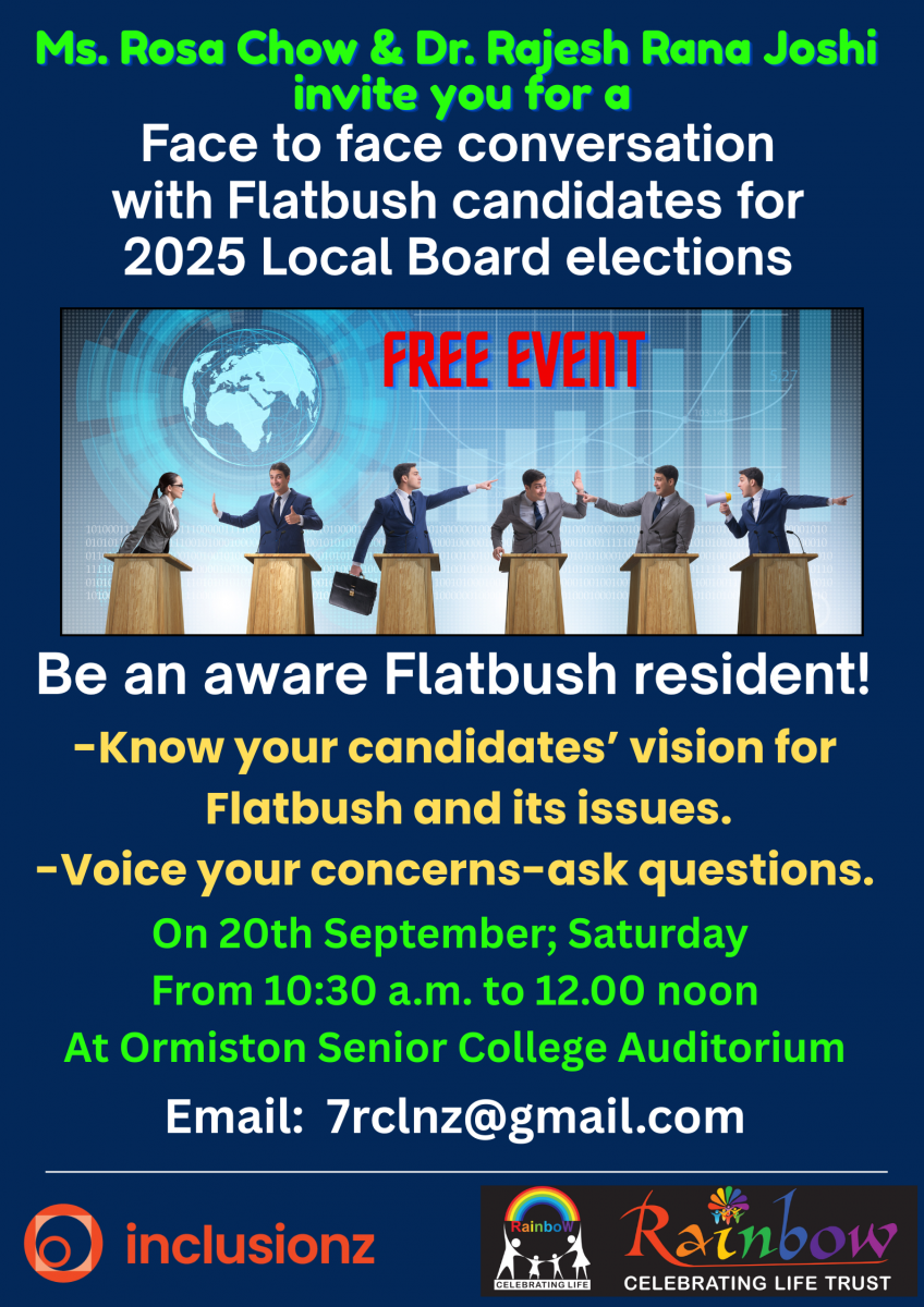 As you know Flatbush is a new sub-division in the 2025 Howick Local Board Elections. There will be three elected representatives. Here is an opportunity for our communities to meet Flatbush candidates. We need to know their vision and ask them questions about Flatbush issues.