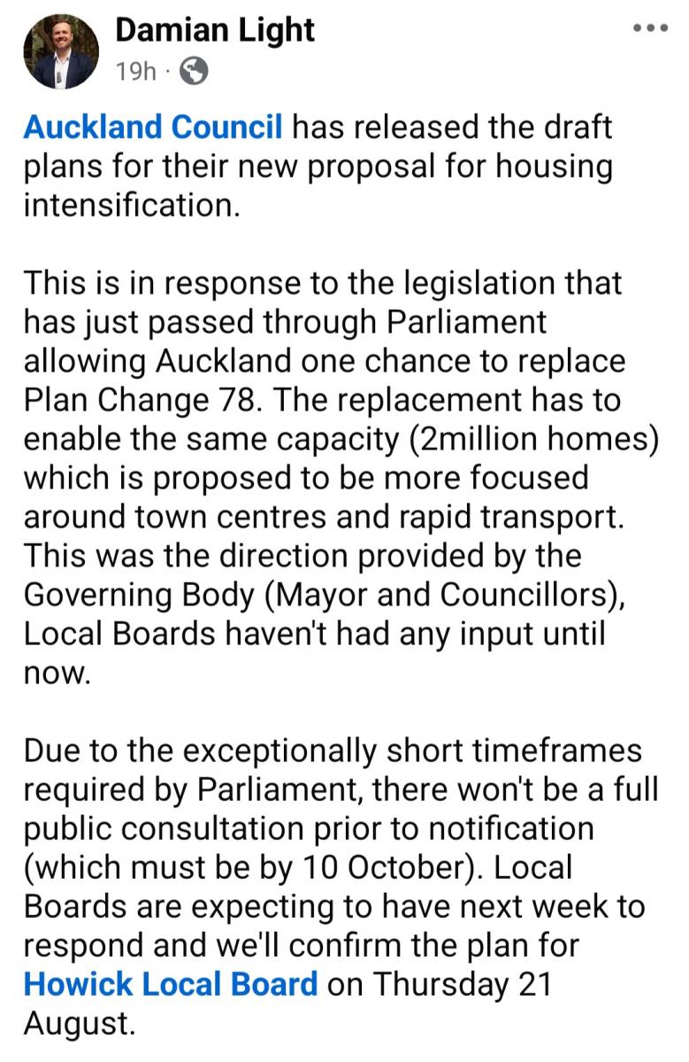 This is in response to the legislation that has just passed through … View moreSaw this on Facebook from Damian Light. Sharing this for anyone in East Auckland who cares about how our neighbourhoods grow.