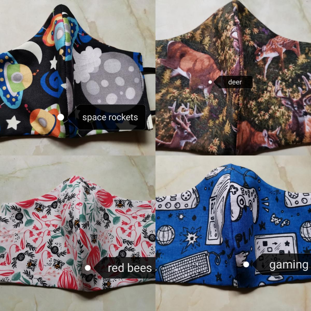 Kids and adults sizes, $10 each. Double layer cotton, lots of fabrics available. Pickup Forrest Hill