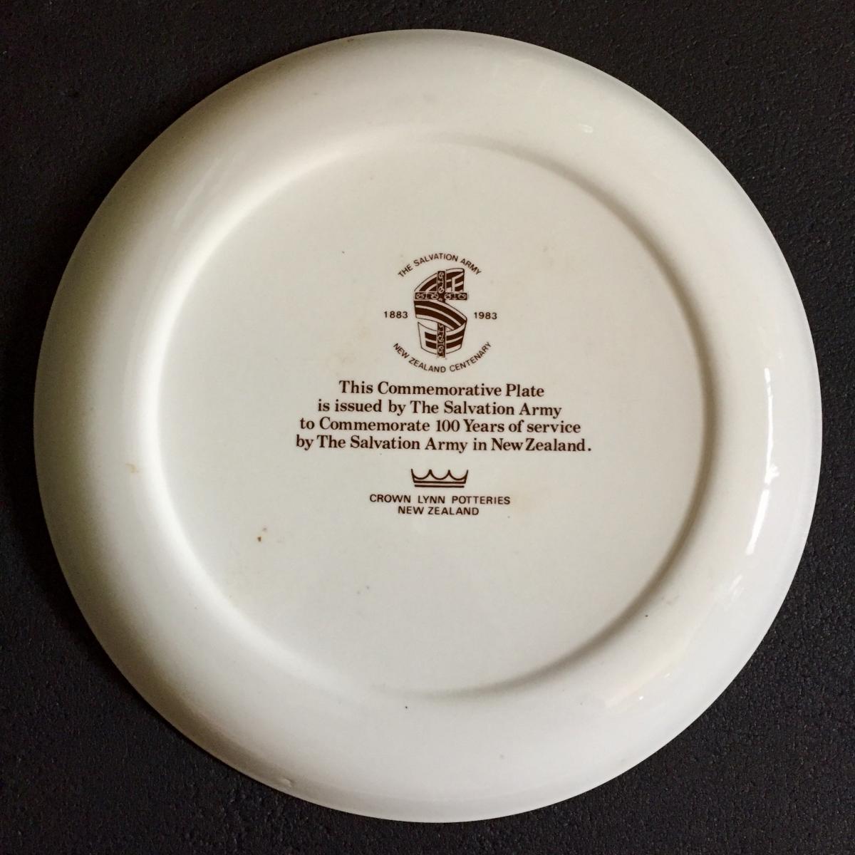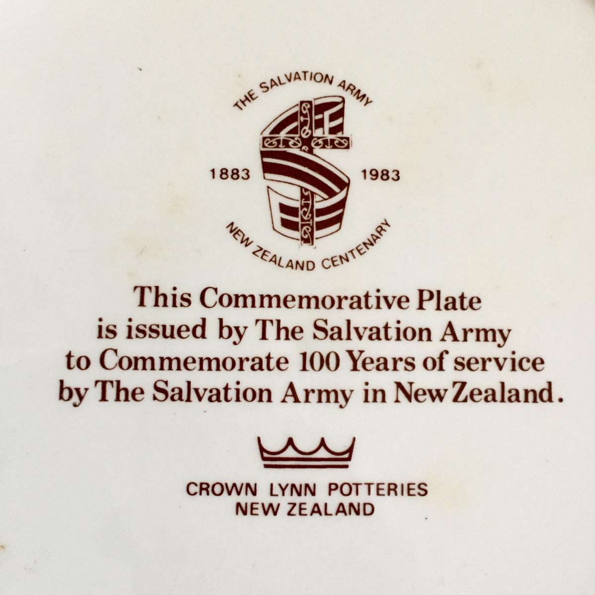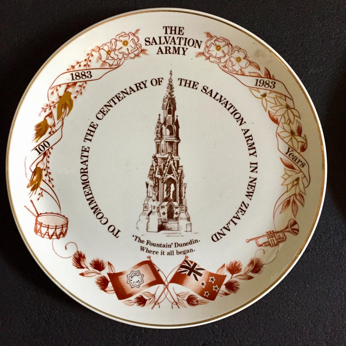 This plate commemorates the centenary of The Salvation Army in New Zealand, celebrating "100 Years" from "1883" to "1983". It features an image of 'The Fountain' in Dunedin, where The Salvation Army's work in New Zealand began, along with imagery of … View moreThis plate commemorates the centenary of The Salvation Army in New Zealand, celebrating "100 Years" from "1883" to "1983". It features an image of 'The Fountain' in Dunedin, where The Salvation Army's work in New Zealand began, along with imagery of flags, a drum, and a trumpet, all framed by floral motifs and a gold rim.