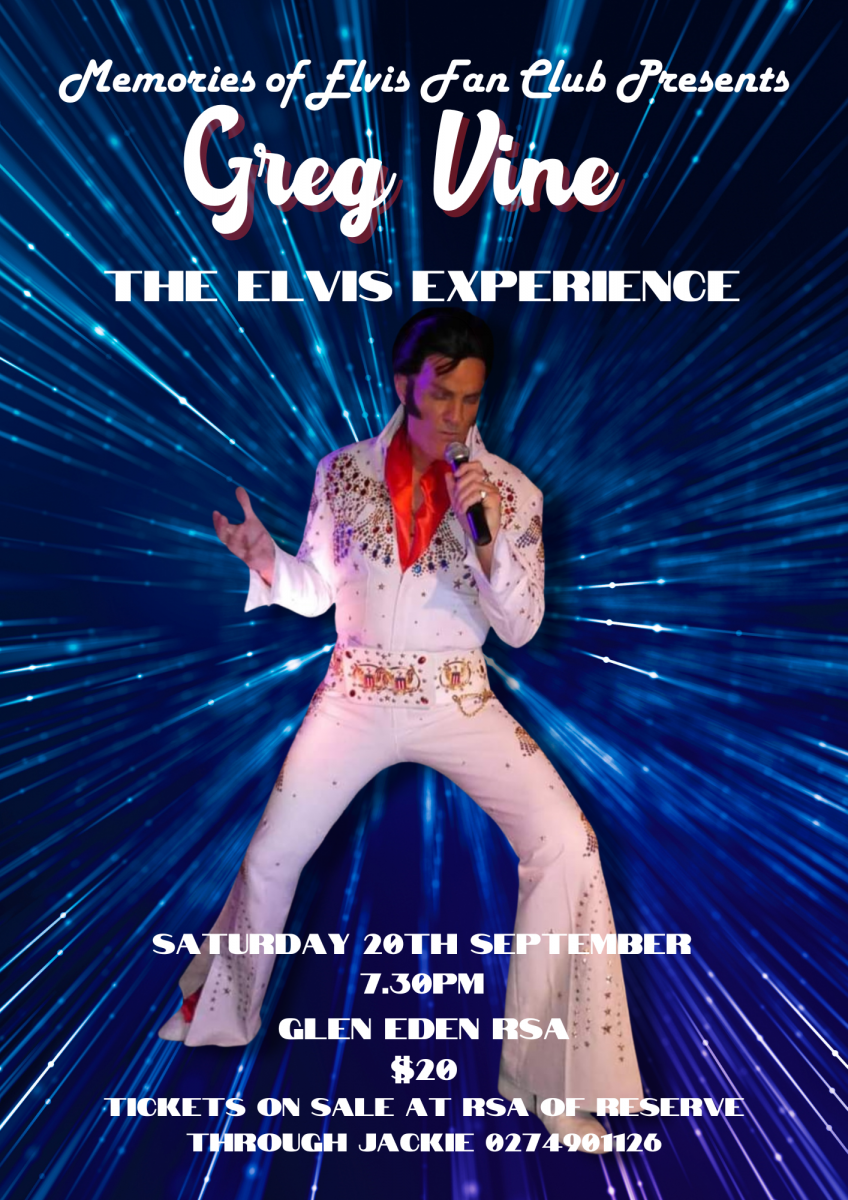 The Memories of Elvis Fan Club are excited to have Greg Vine as our Elvis Tribute Artist on Saturday 20th September at the Glen Eden RSA. Starts at 7.30pm and cost is $20pp. Greg is just back from Australia where he has been performing and so make sure you bring your dancing shoes and that massive … View moreThe Memories of Elvis Fan Club are excited to have Greg Vine as our Elvis Tribute Artist on Saturday 20th September at the Glen Eden RSA. Starts at 7.30pm and cost is $20pp. Greg is just back from Australia where he has been performing and so make sure you bring your dancing shoes and that massive smile. Tickets on sale at RSA or reserve through Jackie phone or text 0274901126