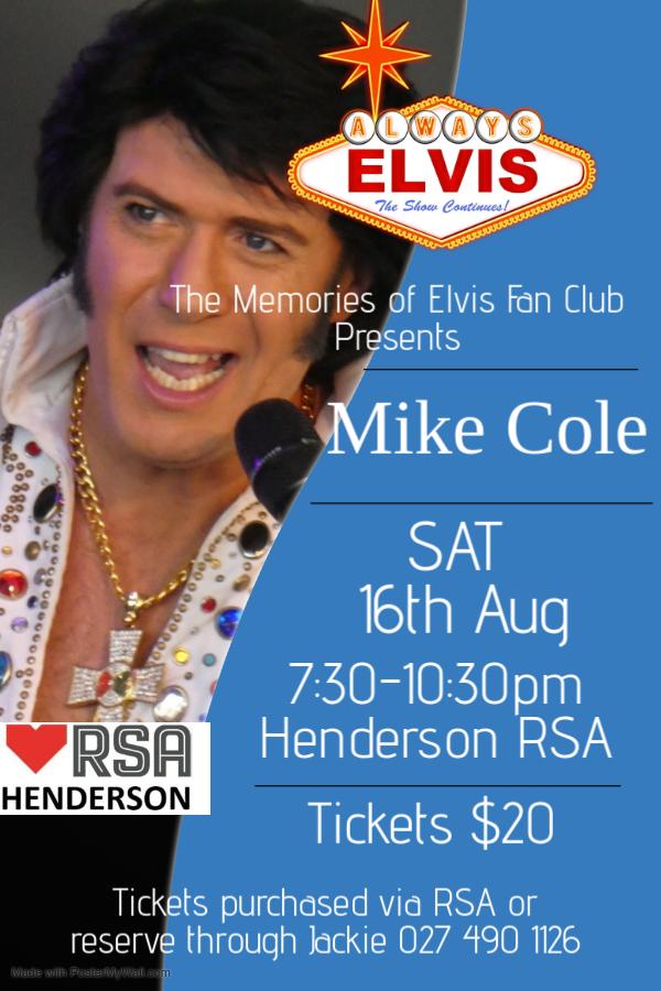 Join the Memories of Elvis Fan Club in Remembering Elvis on the 16th August at the Henderson RSA with the wonderfully talented Mike Cole. Start at 7.30pm and cost is cash $20. Restaurant and bar will be open. We lost Elvis on 16th August 1977 but his music is still the best ever so bring your … View moreJoin the Memories of Elvis Fan Club in Remembering Elvis on the 16th August at the Henderson RSA with the wonderfully talented Mike Cole. Start at 7.30pm and cost is cash $20. Restaurant and bar will be open. We lost Elvis on 16th August 1977 but his music is still the best ever so bring your dancing shoes. Tickets on sale at Henderson RSA or reserve through Jackie 0274901126
