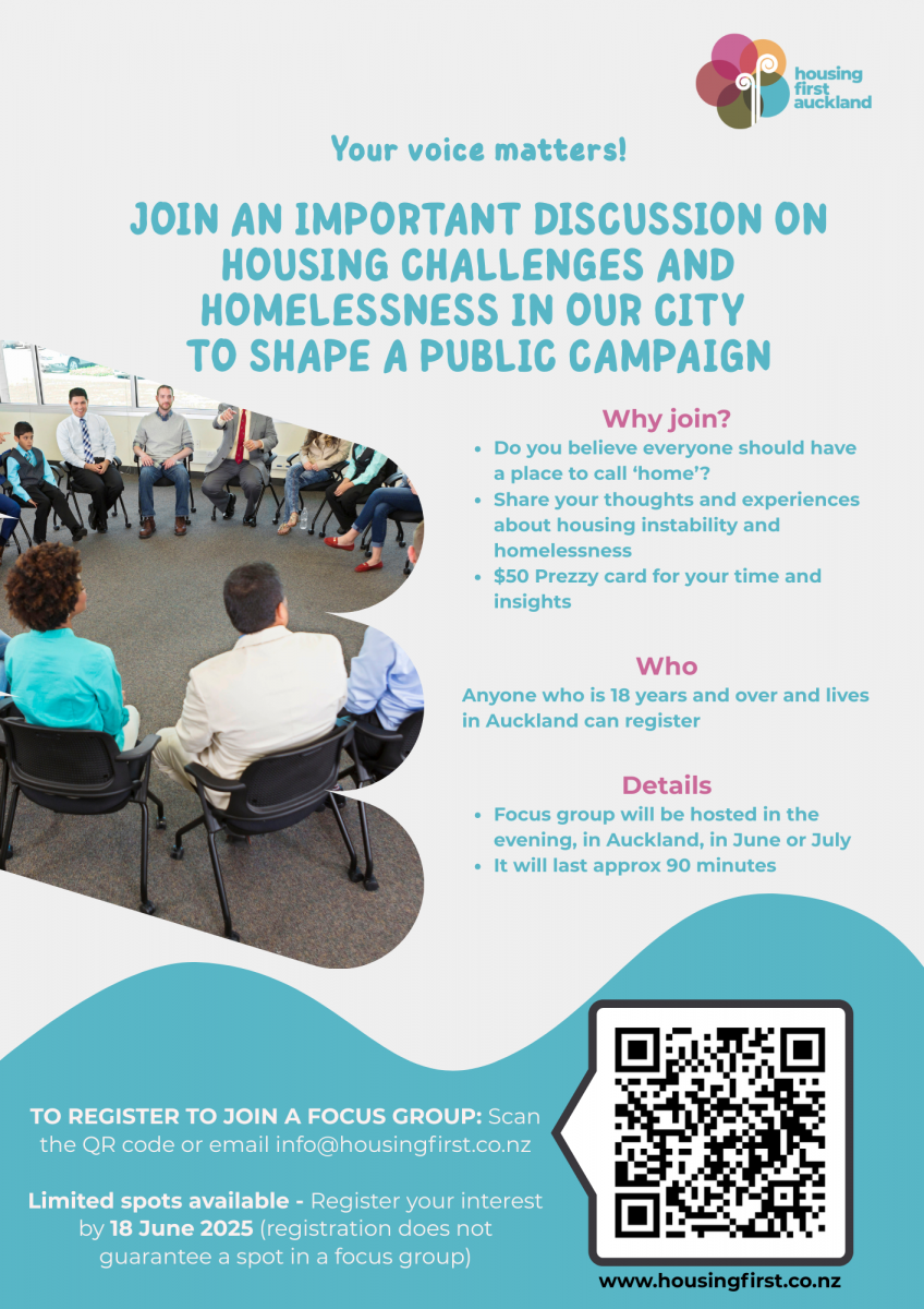 Have your say on housing and homelessness in Auckland. Housing First Auckland is hosting Focus Groups where your voice can help shape future messaging, public campaigns, and influence key decision makers.