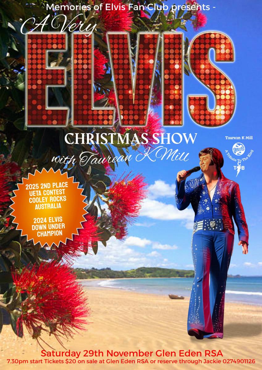 Hi all The Memories of Elvis Fan Clubs Christmas Social Function will be with the amazing and oh so talented Taurean K Mill. Please make sure you come on Saturday 29th November to the Glen Eden RSA start time 7.30pm. Taurean in just one year has achieved so much and is highly sort after. Cost only … View moreHi all The Memories of Elvis Fan Clubs Christmas Social Function will be with the amazing and oh so talented Taurean K Mill. Please make sure you come on Saturday 29th November to the Glen Eden RSA start time 7.30pm. Taurean in just one year has achieved so much and is highly sort after. Cost only cash $20. Wear some Christmas gear and just remember your dancing shoes and an extra $5 cash for our fund raising raffle. RSA Restaurant and Bar will be open. Tickets on sale at RSA or reserve through Jackie phone 0274901126 or text.