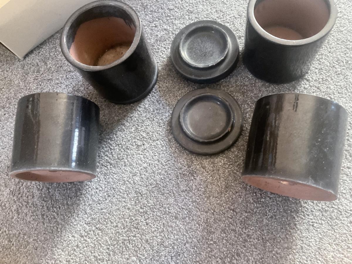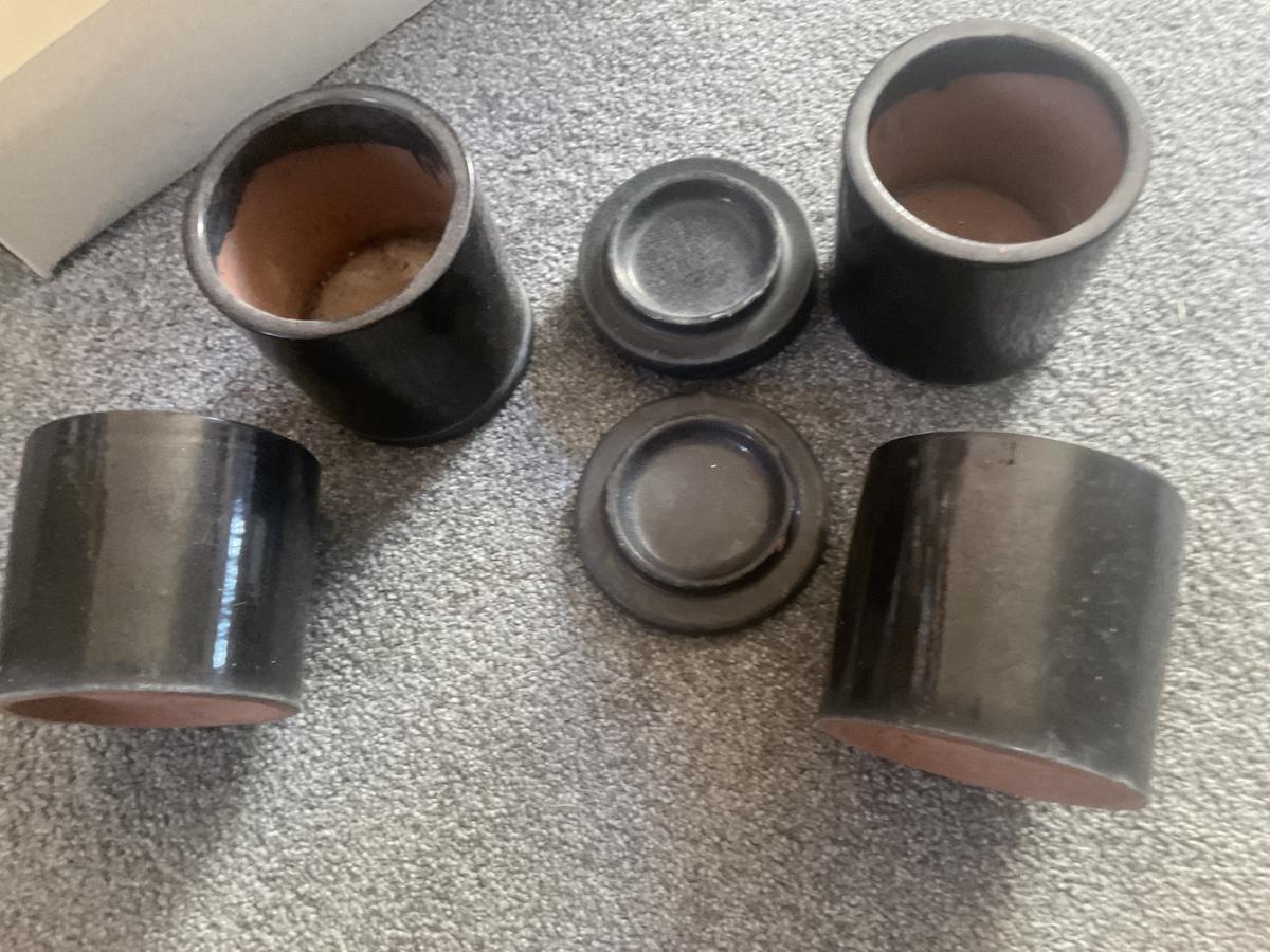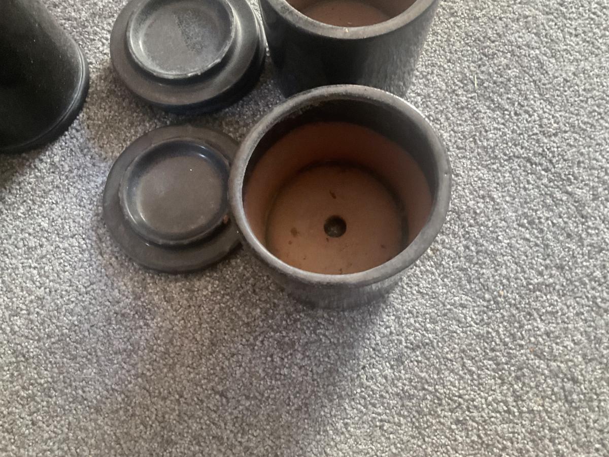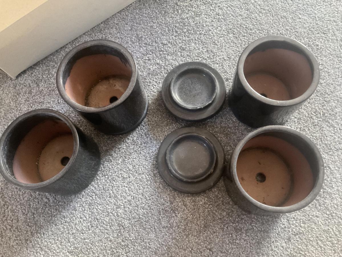 4 SMALL CERAMIC BLACK POTS WITH SAUCER NEW