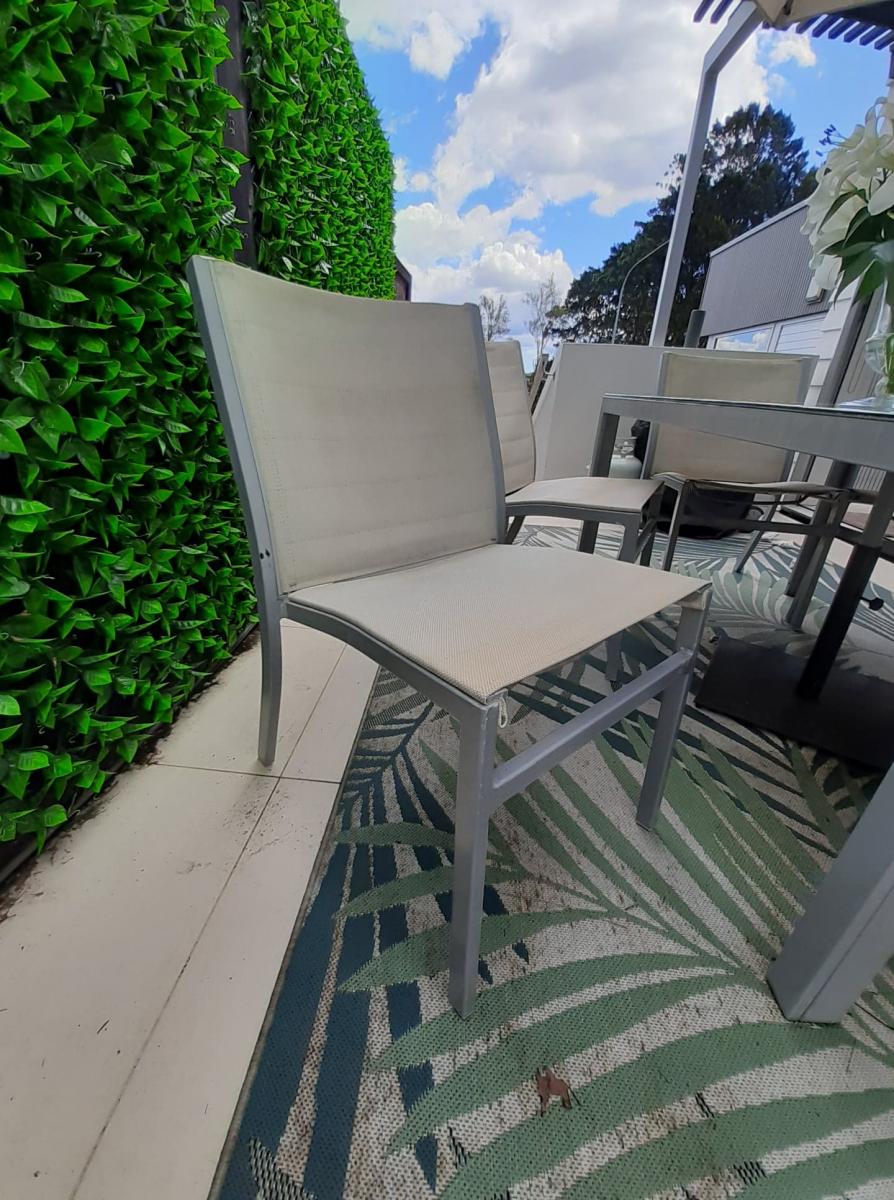 It's definitely been well used over the past few years, two chairs have tears on the back (as seen in full photo) and the material is stained from general outdoor use. A couple of cigarette stains and holes, but all chairs are functional and stable.