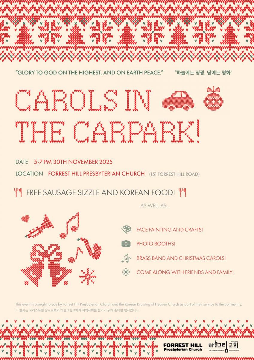 We warmly invite the community for Carols In the Carpark at Forrest Hill Church on Sunday 30 November 5pm - 7pm. Free BBQ & a tasty assortment of 🥘🥢Korean food. Sing 🎤 along to our festive carols 🎄& brass band 🎺🎷🪇 afterwards. … View moreHave some festive 🎄cheer with us!