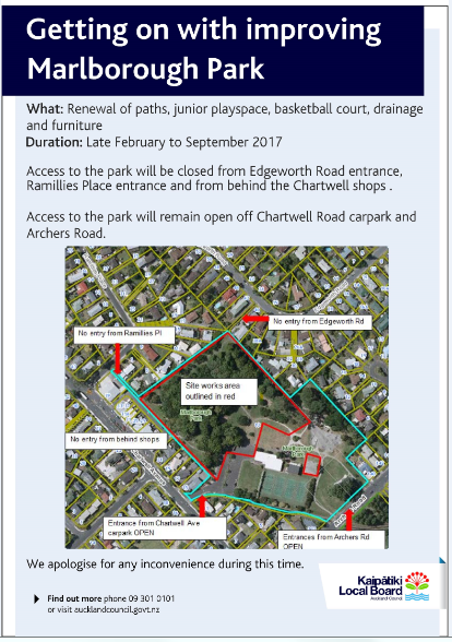 During this time, you will only be able to access the park from the main carpark off Chartwell Ave and from Archers Road. The Edgeworth Rd, Ramillies Place and entrance from behind Chartwell shops will be closed.