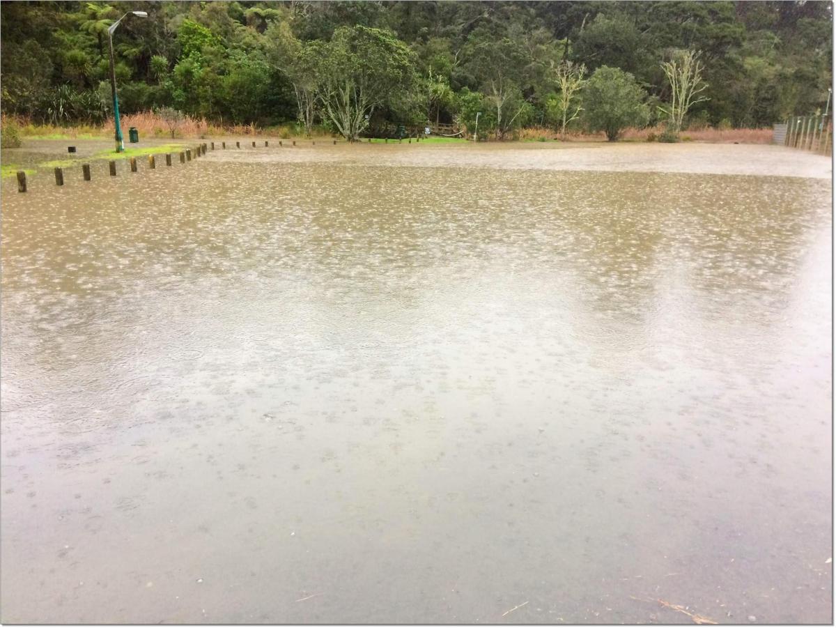 Pictured: Flooding at the Little Shoal Bay Reserve northern carpark last weekend and earlier this year; A map of the proposed location for freedom camping at Little Shoal Bay Reserve.