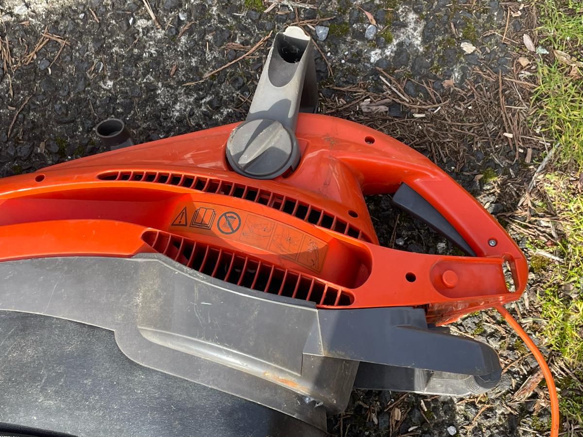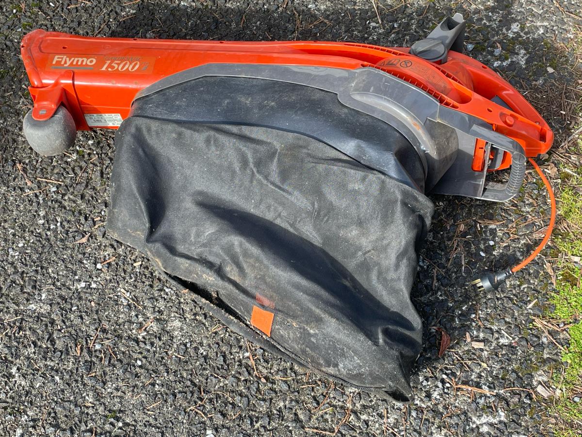 Has been sitting in the garage for a while, but still functions perfectly well, and does a good job sucking up leaves. The front is on a wheel to help support the weight, which makes it lighter and easy to use.
