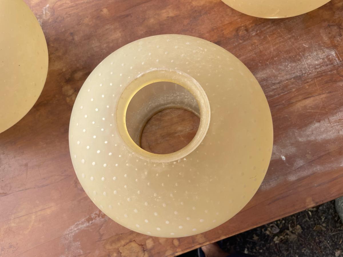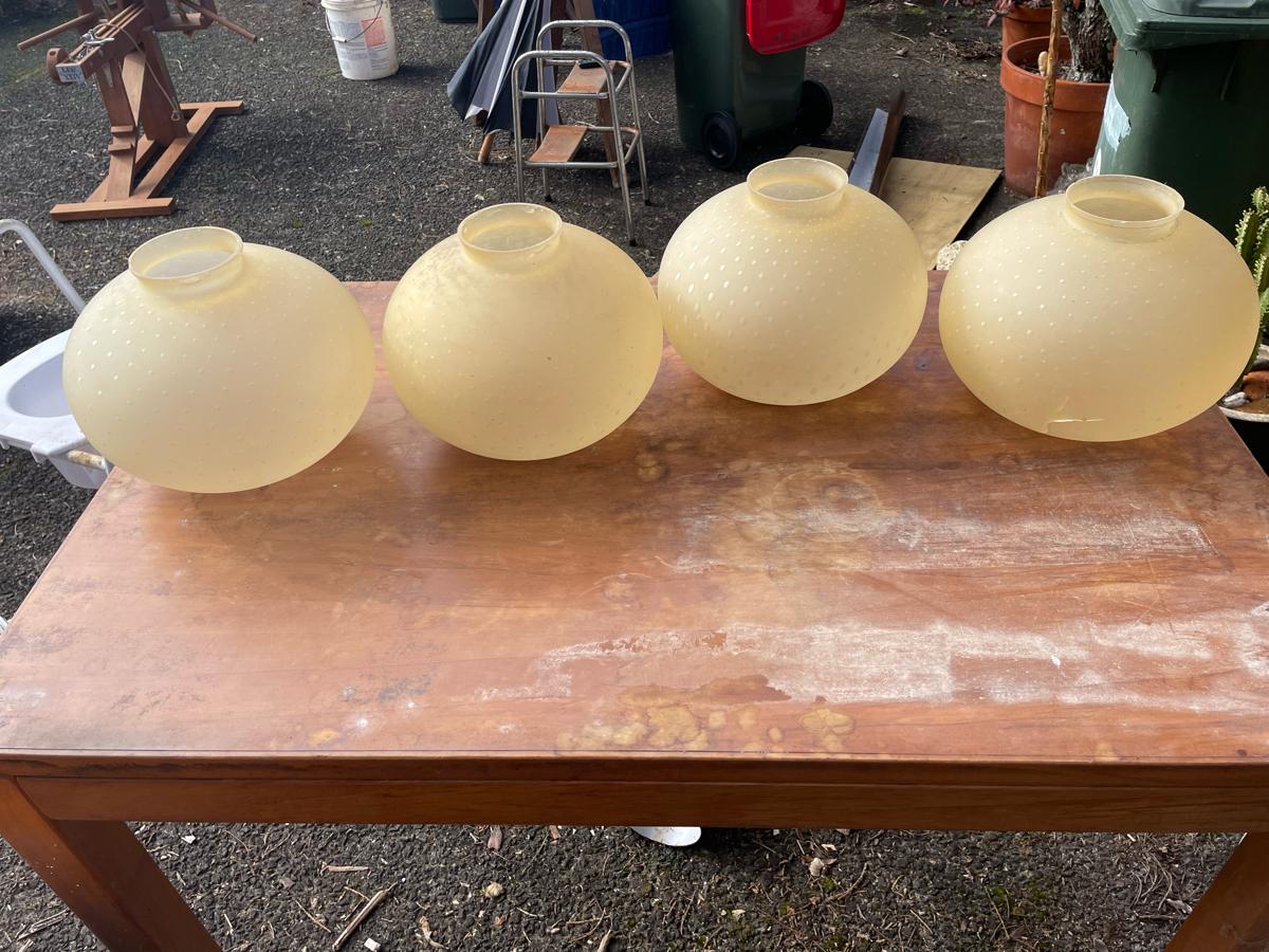Four lovely lamp shades, in good condition but they do need a good clean. One has a crack on the bottom, as shown in the picture.