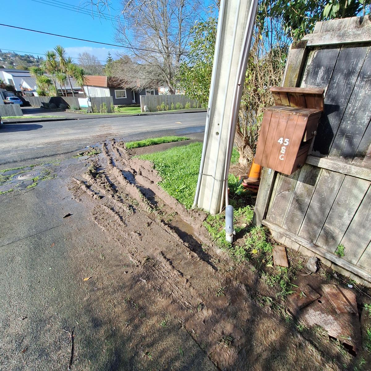 Not all neighbours are good. Some are simply ill bred or lousy drivers. There is no need to smash letterboxes and wreck berms. There is no need for this. I am not allowed enough freedom of speech to tell you what I think about this...."it" only just missed the phone/fibre cables.