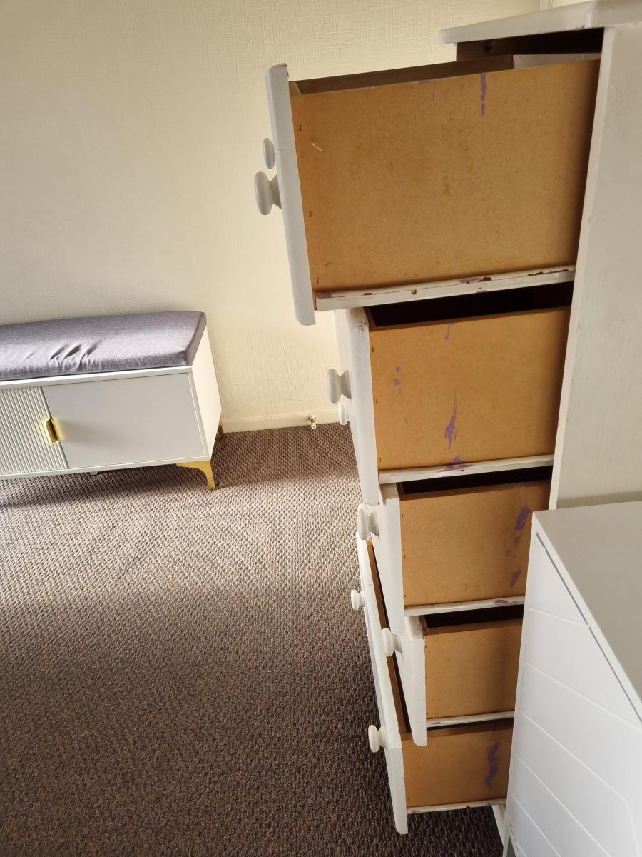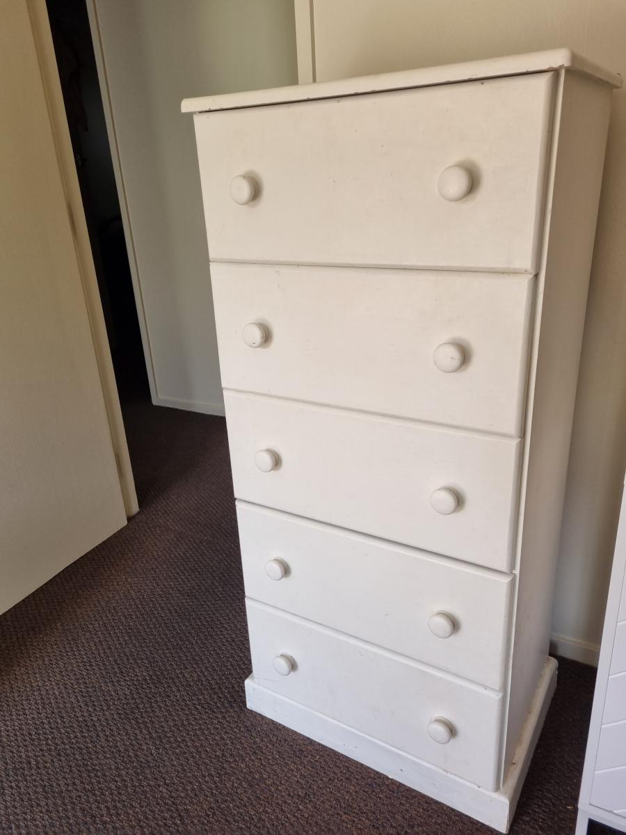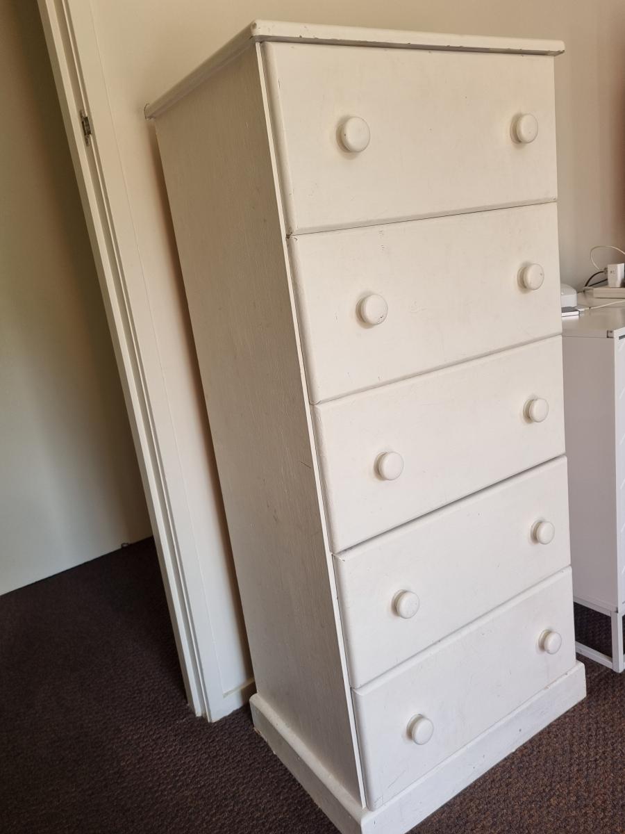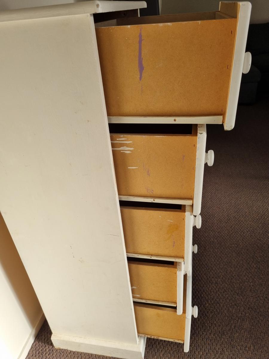 Runners all good, condition used, pls see photos carefully before purchasing, it's quite tall as it's slimmer than standard tall boy, 5 Drawers tallboy