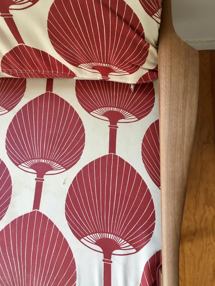 This will need reupholstering as the fabric has seen better days. There are a number of tears and marks to the fabric on the seats and one of the zippers is broken. The backrest cushion covers are in much better condition with no tears or zip issues.