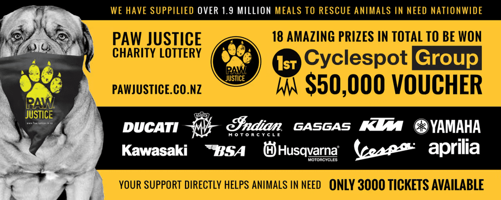 The Paw Justice Charity Lottery is drawn Father’s Day, 12PM, live at Cyclespot Auckland and streamed on Facebook.