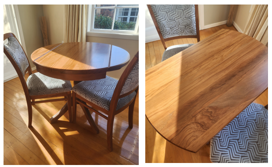 Includes 2x rimu Melody chairs upholstered with Warwick Plaza (Duck Egg) fabric. … View moreBeautiful solid rimu dining table with folding extensions and 2x chairs, near new, perfect size for small or compact dining area or apartment living. Belmont design, round Double Drop-Leaf NZ-made by Danske Mobler.