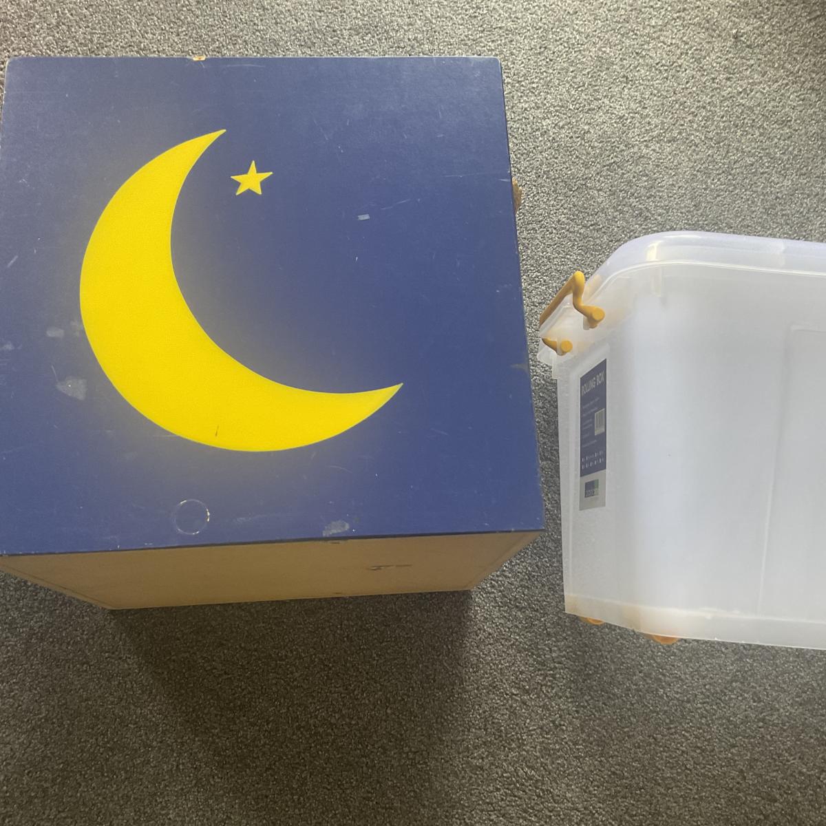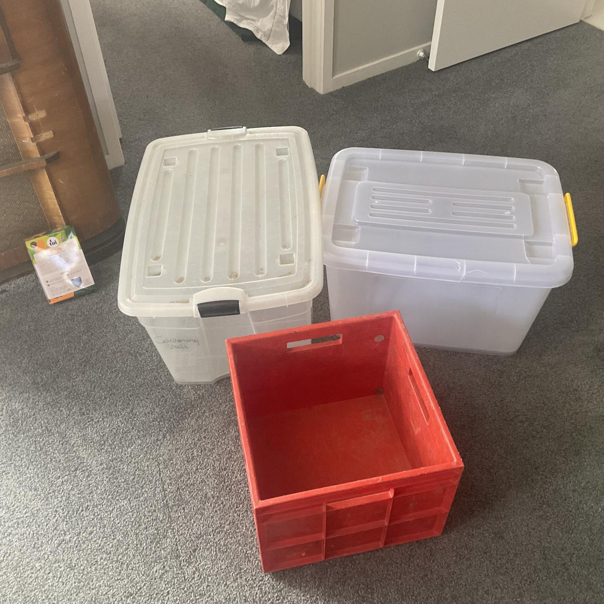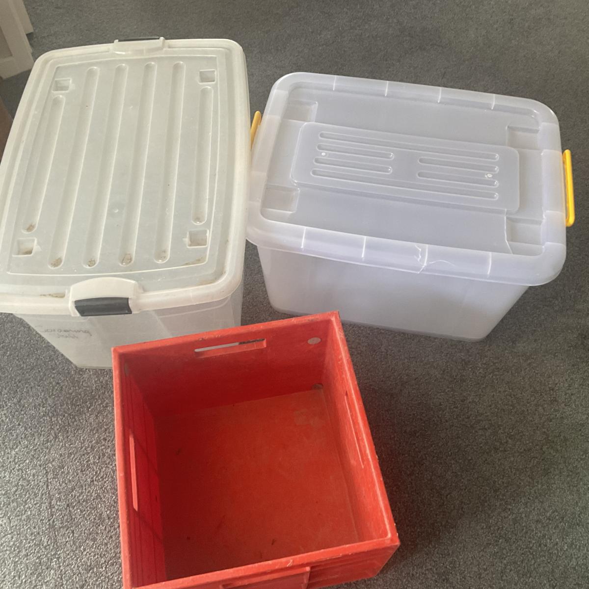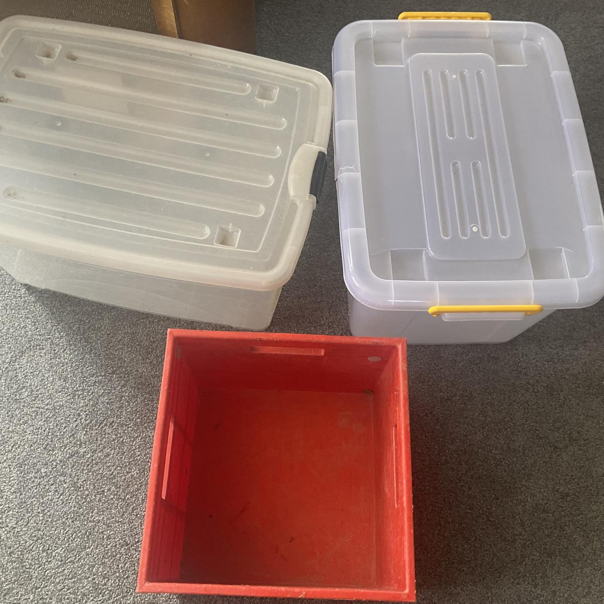 2 MIDIUM STARAGE CONTAINERS ON HAS SMALL CRACK PLUS 1 square RED CONTAINER