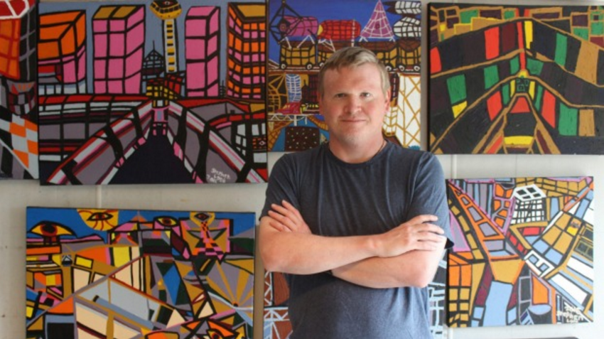 Art student Stephen Lord, who has Asperger's syndrome, has displayed works in his first exhibition.