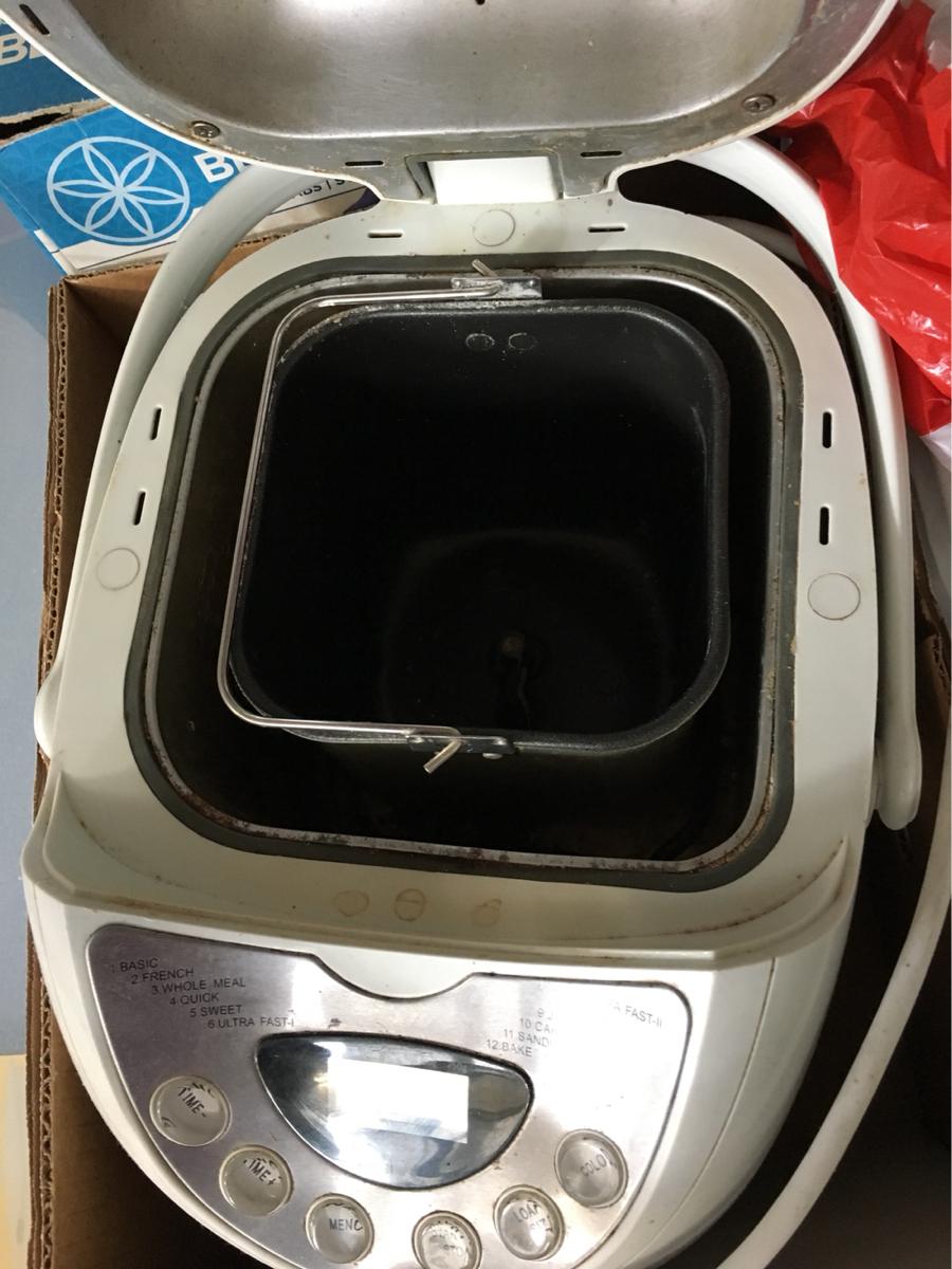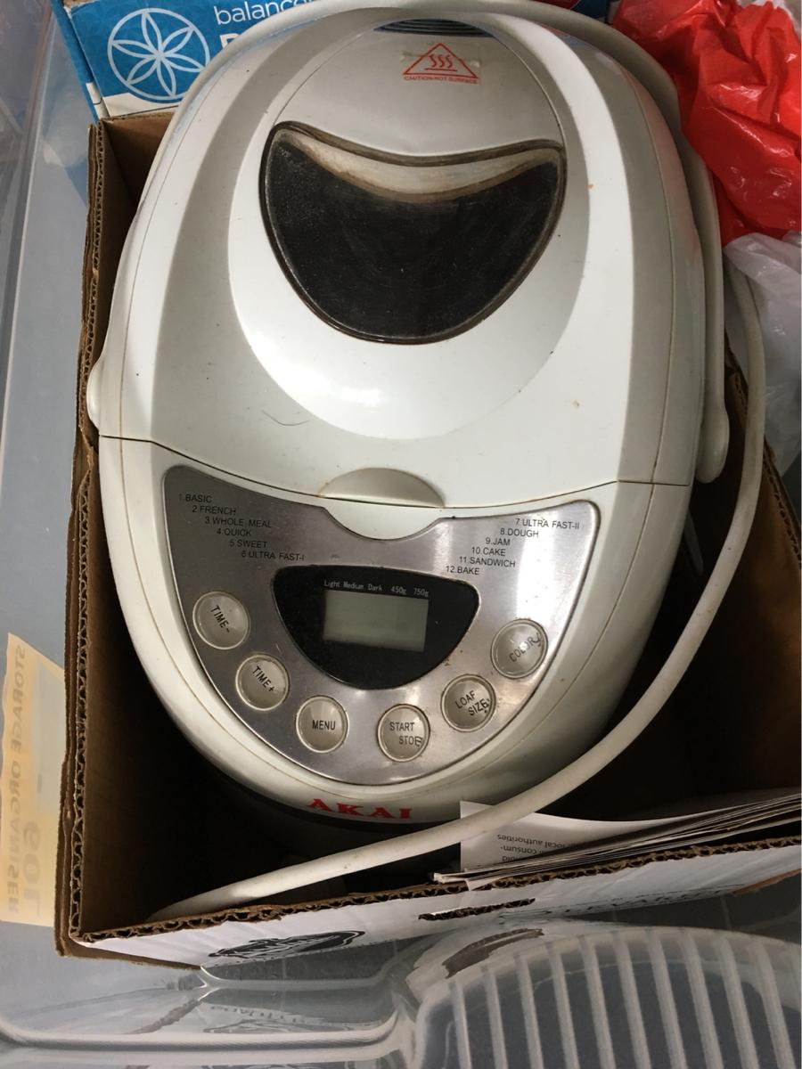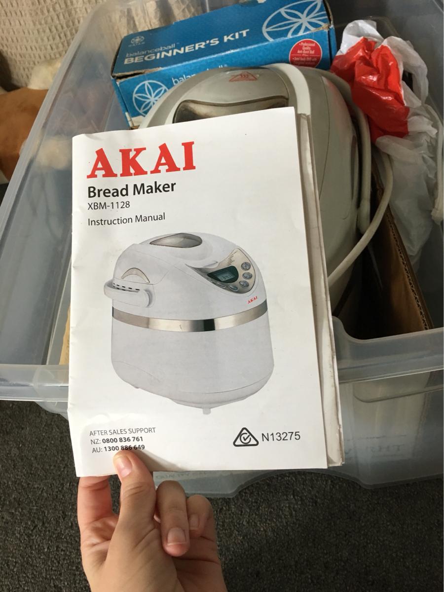 Akai bread maker. Comes with instruction manual that also has recipes in it for some really yummy breads. Have only tried a few. Not used very much.