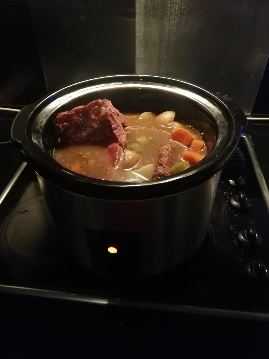 bacon bones, potatoes, carrots, celery, beef + vege soup mix, salt + pepper
