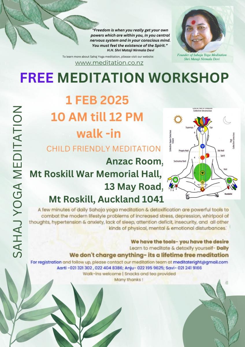 Learn to meditate for free + free follow up classes. Join the workshop on 1st Feb 2025 in Mt Roskill War Memorial Hall, 13 May Road, Mt Roskill, Auckland from 10 am till 12pm. Please walk in and enjoy the beauty of meditation.
