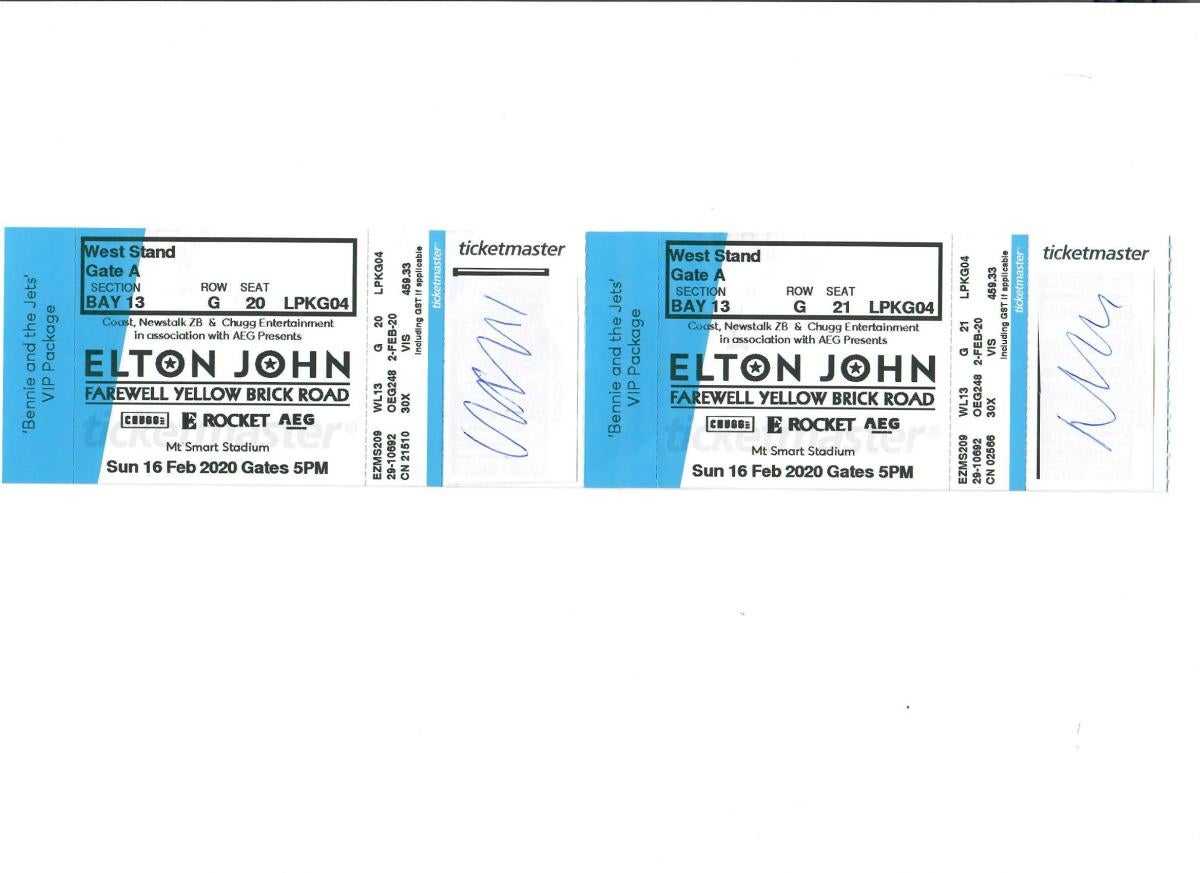 Hi Neighbours, I purchased 2 extra Elton John VIP tickets for family, who now can't make it up to Auckland. Concert is Sunday 16 February at Mt Smart. These are excellent seats, West Stand, Bay 13, Row G, close to stage (lower level) with VIP extras. I can provide more details if you are … View moreHi Neighbours, I purchased 2 extra Elton John VIP tickets for family, who now can't make it up to Auckland. Concert is Sunday 16 February at Mt Smart. These are excellent seats, West Stand, Bay 13, Row G, close to stage (lower level) with VIP extras. I can provide more details if you are interested. I am still going!