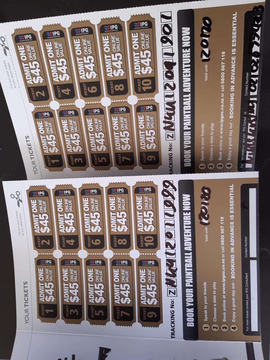 Kia ora. I have 20 paintball tickets for sale, valid until 20. January 2020. I bought them for my son's birthday, but have no longer need for it. If you can make use of them, get in touch. My phone number is 02102225766. They are worth $900. Make an offer. I will give half of the money to a … View moreKia ora. I have 20 paintball tickets for sale, valid until 20. January 2020. I bought them for my son's birthday, but have no longer need for it. If you can make use of them, get in touch. My phone number is 02102225766. They are worth $900. Make an offer. I will give half of the money to a charity that provides school lunches for a low decile primary school in Mt Roskill.