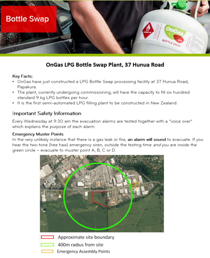 There’s a new OnGas LPG Bottle Swap Filling Plant in Papakura at 37 Hunua Road. You can read more about the new facility and the safety information in the article on their website.