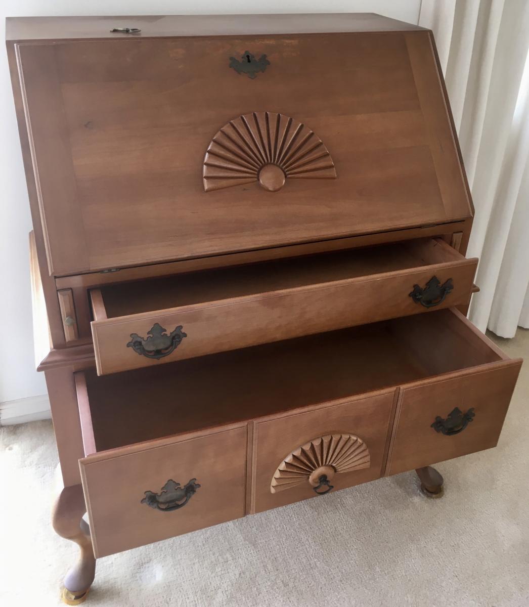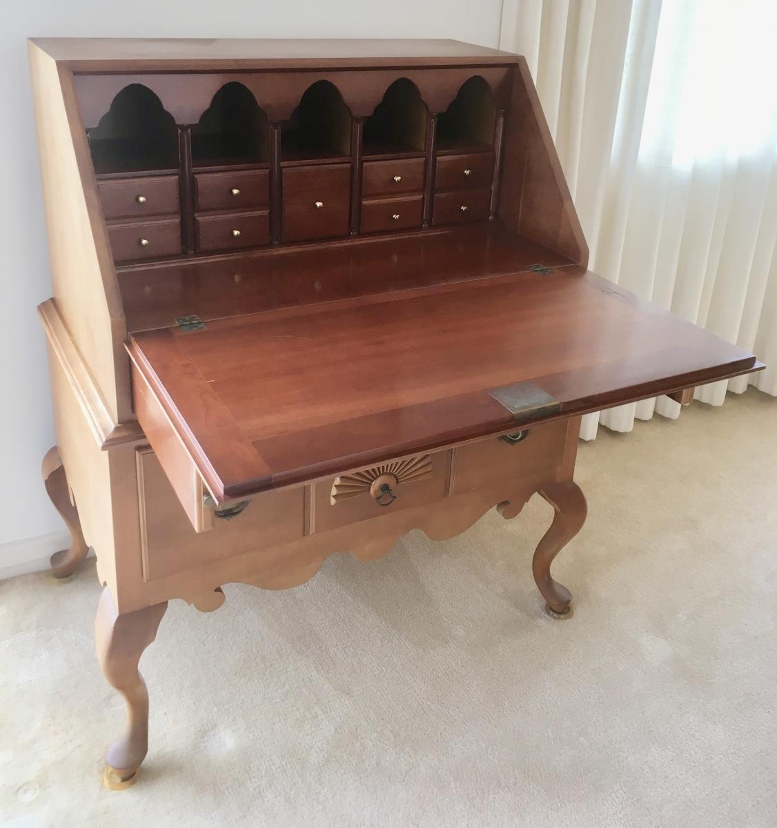 Made by Cassady Cherry Reproduction in Bowling Green, Kentucky, USA before 1969. The current owner has enjoyed this desk for 50 years; 30 years in Auckland, New Zealand.